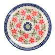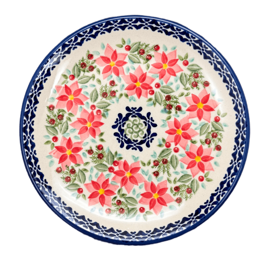 Imagine a dessert plate so enchanting that it steals the spotlight before the sweet course even arrives. The Polish Pottery 7.25" Dessert Plate from Manufaktura, adorned in the captivating "Pink Poinsettia" pattern, does just that. Each plate is a canvas, featuring a vibrant medley of pink poinsettias encircled by lush green leaves and dotted with cheerful red berries, all beautifully framed by a playful dance of green, red, and blue shapes. This isn’t just a plate; it’s a piece of art meticulously crafted in the heart of Boleslawiec, Poland, where artisans pour their soul into every brushstroke.