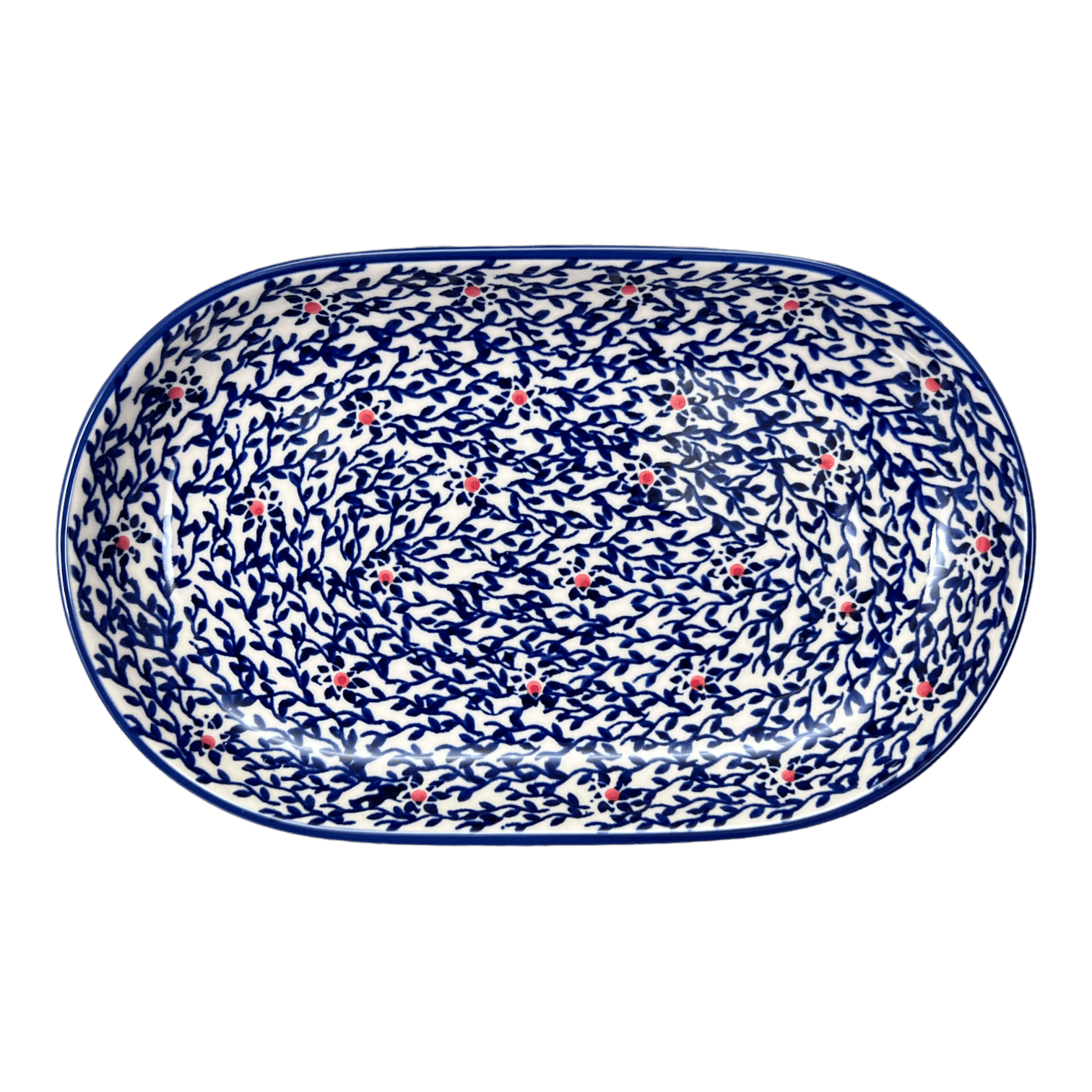 Handcrafted with love in Boleslawiec, Poland by skilled artisans, this oval roaster showcases the stunning "Blue Canopy" pattern. With its intricate design elements incorporating Leaves and Flowers, the predominantly Blue color with accents in White and Red, this roaster is not only functional but also a work of art that will captivate your guests.