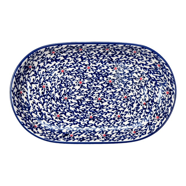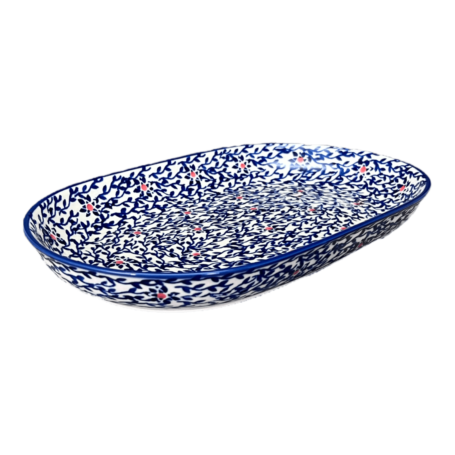 Introducing the Polish Pottery 7" x 11" Oval Roaster by Manufaktura in the exquisite "Blue Canopy" pattern (IS04). This oval roaster is not just your ordinary dish - it's a versatile masterpiece! Whether you're using it as part of your everyday plate set, roasting meats and veggies, or creating a delightful Soup/Salad or Soup/Sandwich combination with the addition of an individual soup tureen (B006), this roaster has got you covered.