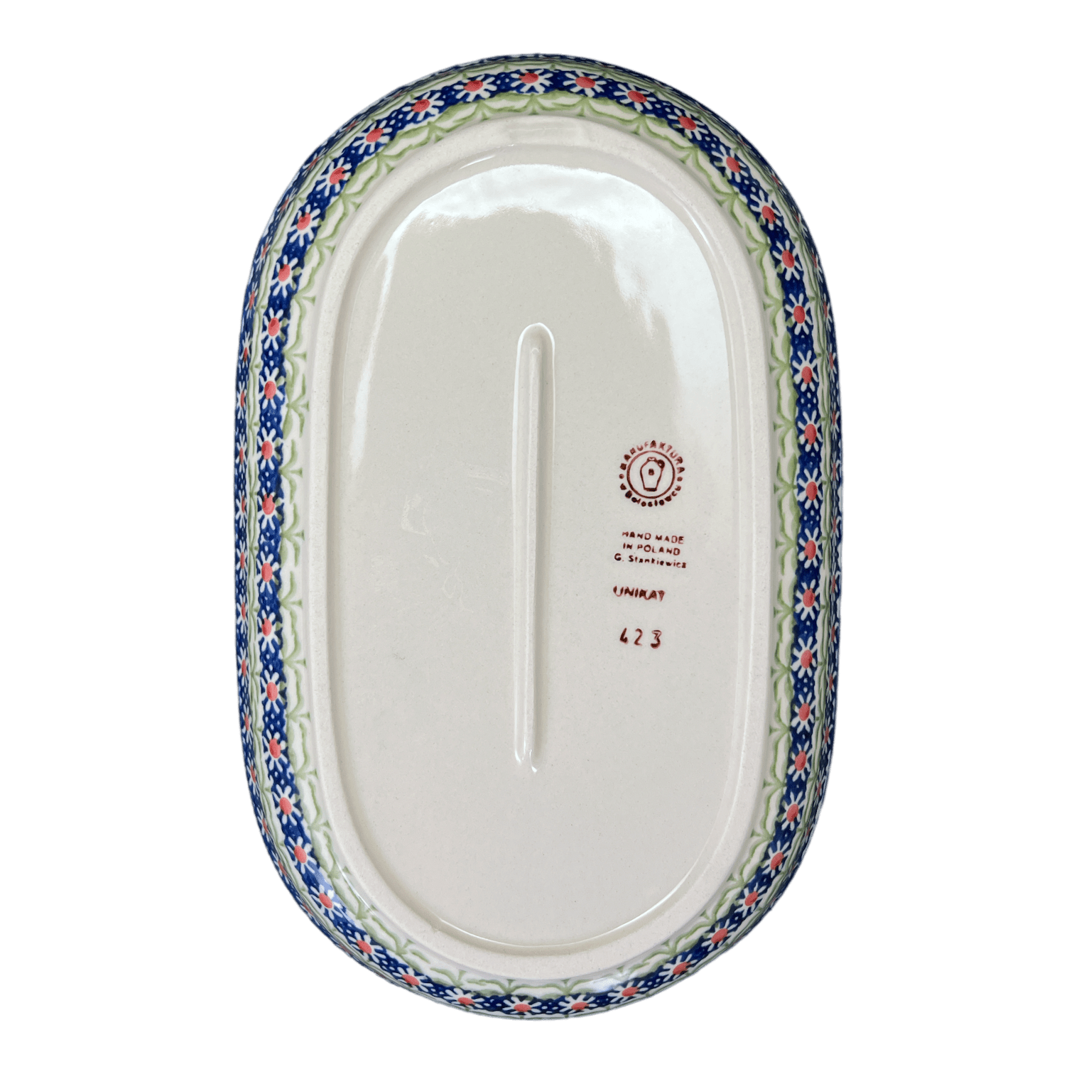 Introducing the Polish Pottery 7" x 11" Oval Roaster by Manufaktura in the captivating "Daisy Rings" pattern (GP13). This oval roaster is not your ordinary dish - it is a versatile powerhouse that will elevate your everyday meals to a whole new level of deliciousness! Whether you're roasting meats and veggies or using it as part of your plate set, this oval roaster has got you covered.
