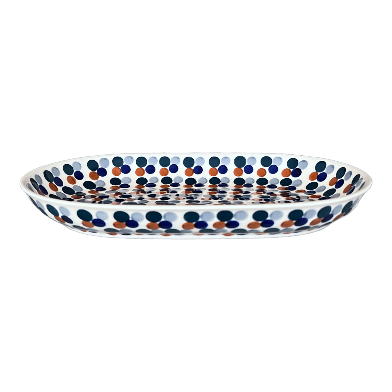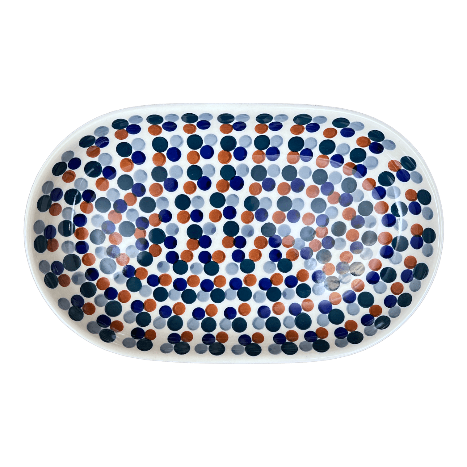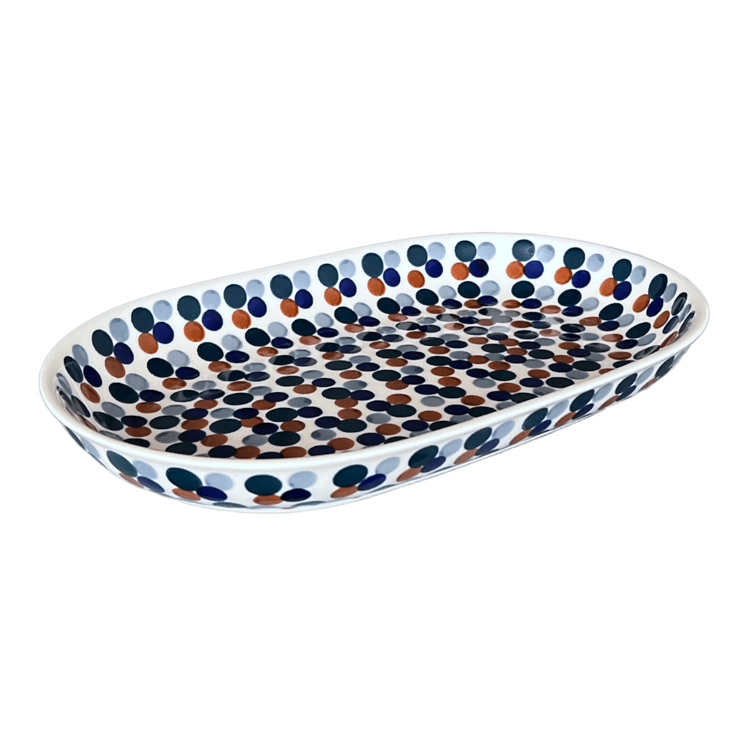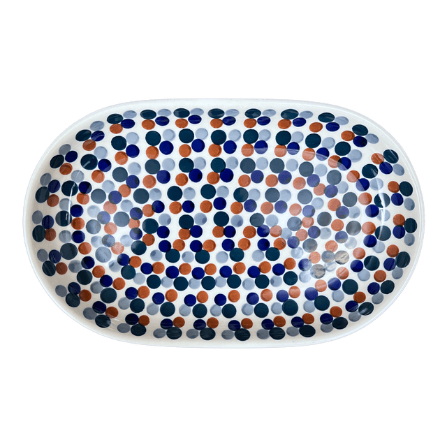 Not only is this oval roaster practical, but it's also a work of art. The "Fall Confetti" pattern, with its captivating design elements incorporating Dots in a predominantly Brown color with accents in Blue and Gray, will add a vibrant touch to your table. Handcrafted in Boleslawiec, Poland by skilled artisans, this piece is a true testament to the beauty of Polish Pottery.