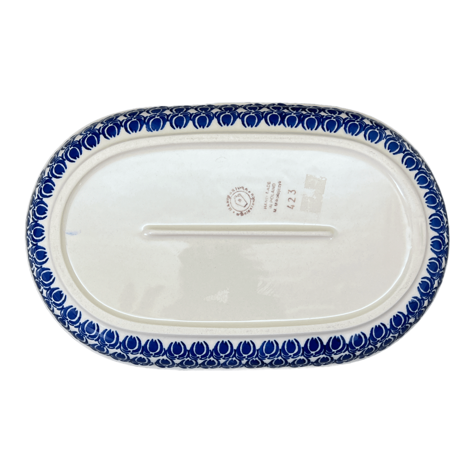 Introducing the Polish Pottery 7" x 11" Oval Roaster by Manufaktura in the captivating "Tulip Blues" pattern (GP16). This oval roaster is not just your ordinary dish, it's a versatile superstar! Whether you're looking to jazz up your everyday plate set, roast meats and veggies to perfection, or create a delightful Soup/Salad or Soup/Sandwich combination with an individual soup tureen (B006), this roaster has got you covered!