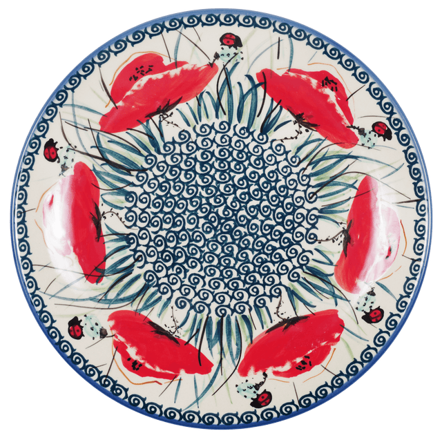 The "Poppy Paradise" pattern is a feast for the eyes, with its vibrant design elements incorporating flowers and ladybugs. The predominantly red color is accentuated by touches of green and white, creating a stunning visual spectacle. Made and hand-painted in Boleslawiec, Poland by skilled artisans, this salad plate is a true work of art.