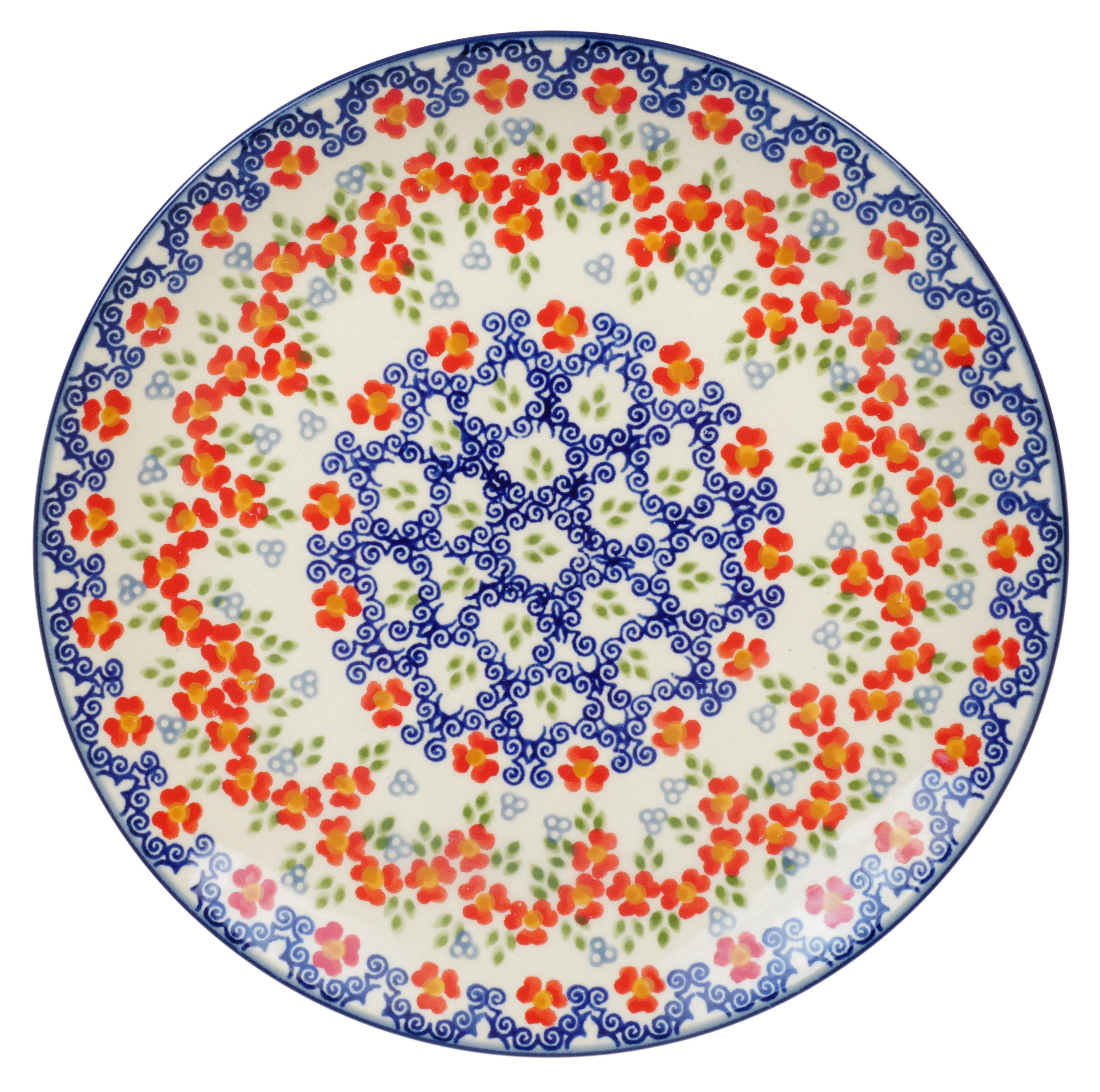 Step into a world where your dinnerware isn't just functional, it's a piece of art! Introducing the delightful Polish Pottery Plate from Manufaktura, adorned with the enchanting "Ring Around the Rosie" pattern. This 8.5" salad plate, perfect for dishing up your favorite greens, also serves as a charming canvas for your sandwiches, cookies, and delectable desserts. Every bite you take is complemented by a flourish of predominantly red flowers, with playful accents of blue, white, and green, turning every meal into a vibrant celebration.