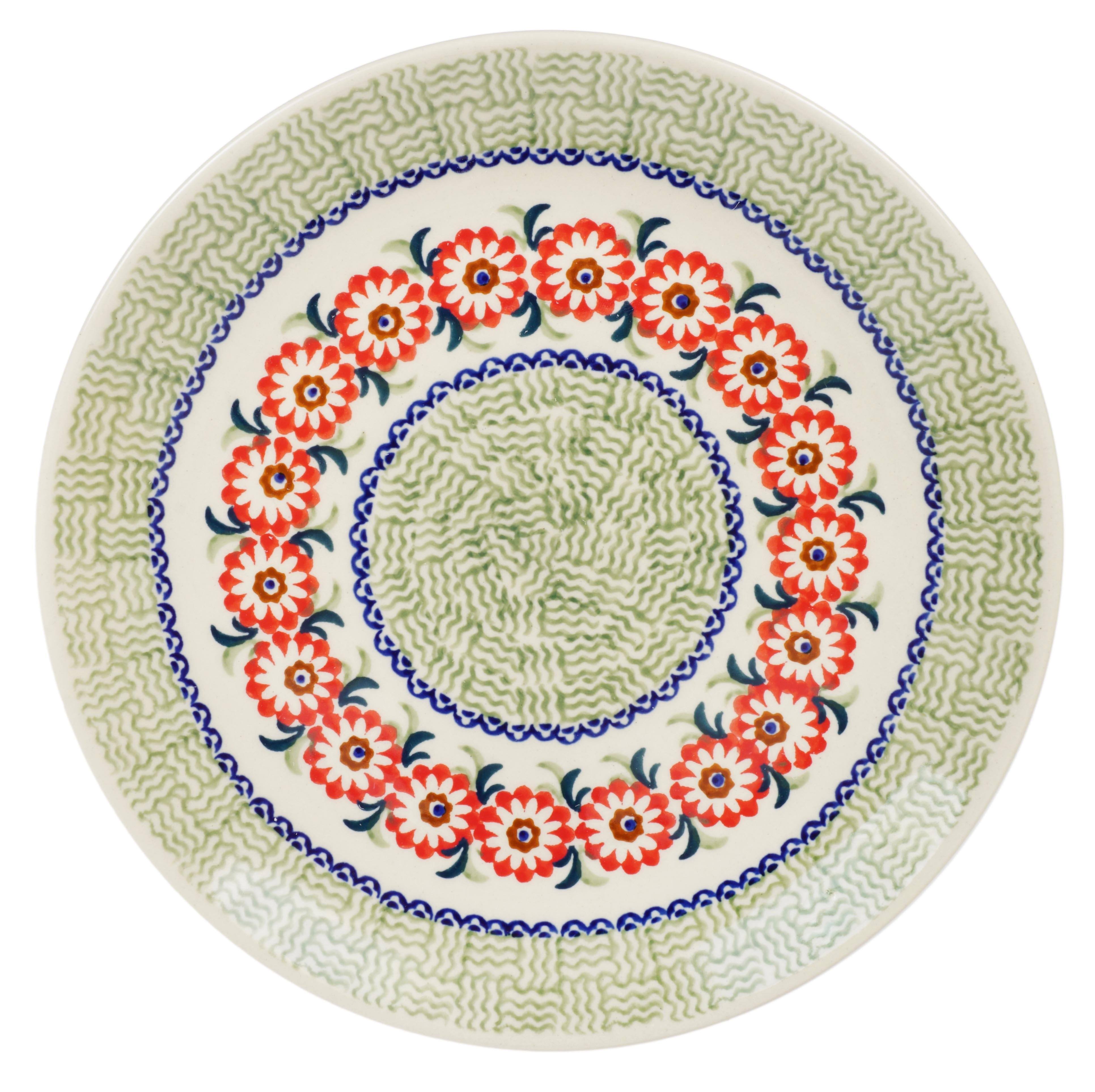 The "Woven Reds" design is a brilliant example of traditional Polish pottery patterns, which are celebrated for their classic beauty and recognizable motifs. This particular plate features a unique green and white weaving pattern at its core, surrounded by a lively chain of red flowers, demonstrating the artistry of the "punching" technique. This hand-stamping method allows skilled artisans to express their creativity, making each plate a one-of-a-kind masterpiece. Although these patterns are termed "simple," the craftsmanship involved is anything but, showcasing a rich heritage of Polish ceramic artistry.