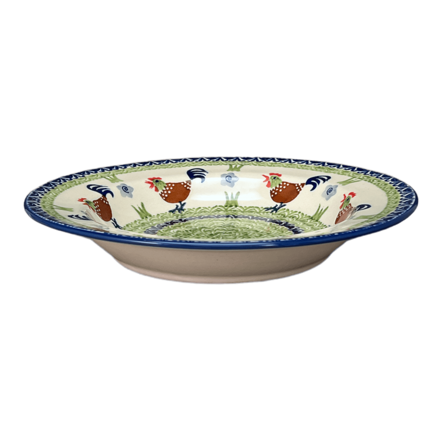 Imagine a table setting that not only serves your delicious homemade meals but also dances with color and charm. That's exactly what the Polish Pottery Soup Plate from Manufaktura brings to your dining experience. With its 9.25" diameter, this round, shallow bowl is perfect for dishing out hearty soups, fresh salads, or twirling pasta. Crafted in the heart of Boleslawiec, Poland, by skilled artisans, this plate features the delightful "Chicken Dance" pattern. The design showcases large, playful chickens in rich brown, with quirky green heads and teal blue tails, all prancing counterclockwise around a vibrant green grass center. It's a pattern that promises to steal the show at any meal and impress your guests with its unique charm.