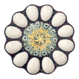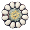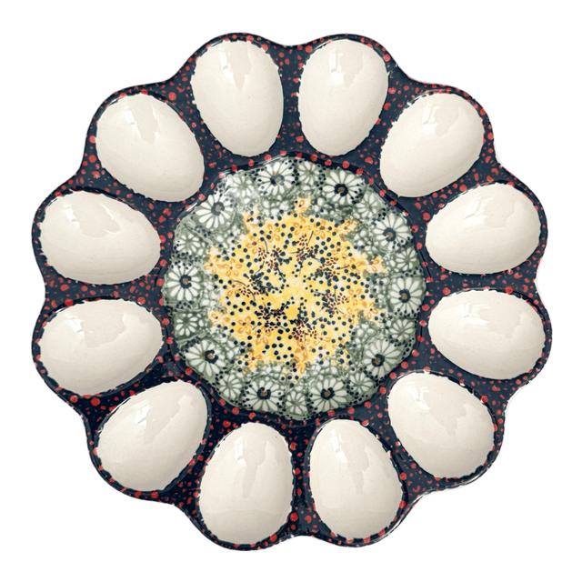 Imagine hosting a delightful brunch where your exquisite taste is not only reflected in the delicious dishes but also in the charming presentation. Enter the 10.25" Polish Pottery Egg Plate by Manufaktura, a true masterpiece from their "Sunshine Grotto" collection. This round plate, expertly crafted in the heart of Boleslawiec, Poland, is not just a dish but a declaration of style. Designed to cradle a dozen deviled eggs, its vibrant yellow backdrop and playful dots and flowers invite a cheer that complements any table setting. Whether you're arranging chocolate-covered strawberries or classic egg hors d'oeuvres, this plate transforms your culinary creations into a visual feast.