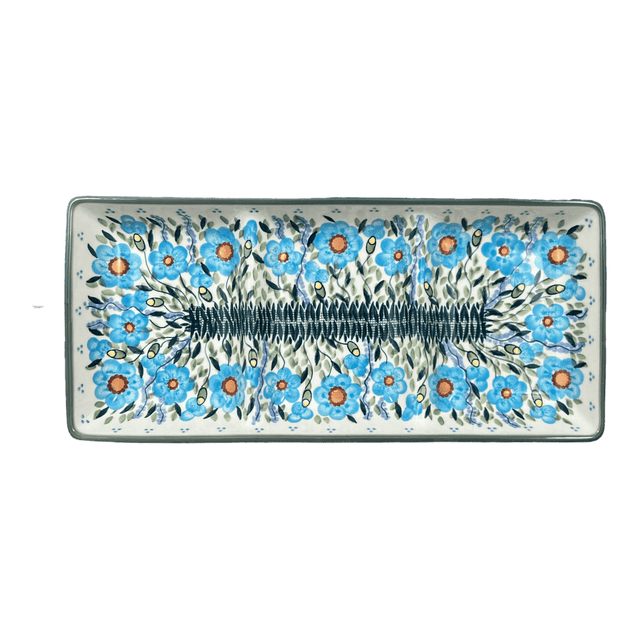 Step into the enchanting world of Manufaktura's Polish Pottery with this exquisite 14" x 6.5" divided dish, a canvas of creativity and a testament to tradition. Imagine serving your favorite triad of treats in the beautifully crafted sections, each designed to hold dips, snacks, or condiments in style. The "Baby Blue Blossoms - Solid Rim" pattern blooms across the dish, showcasing a mesmerizing array of light blue and orange flowers, embraced by a circle of teal green leaves and tall grasses. This artistic arrangement isn't just for show; it’s a gateway to transforming your table setting into a vibrant, inviting display that sparks conversation and admiration.