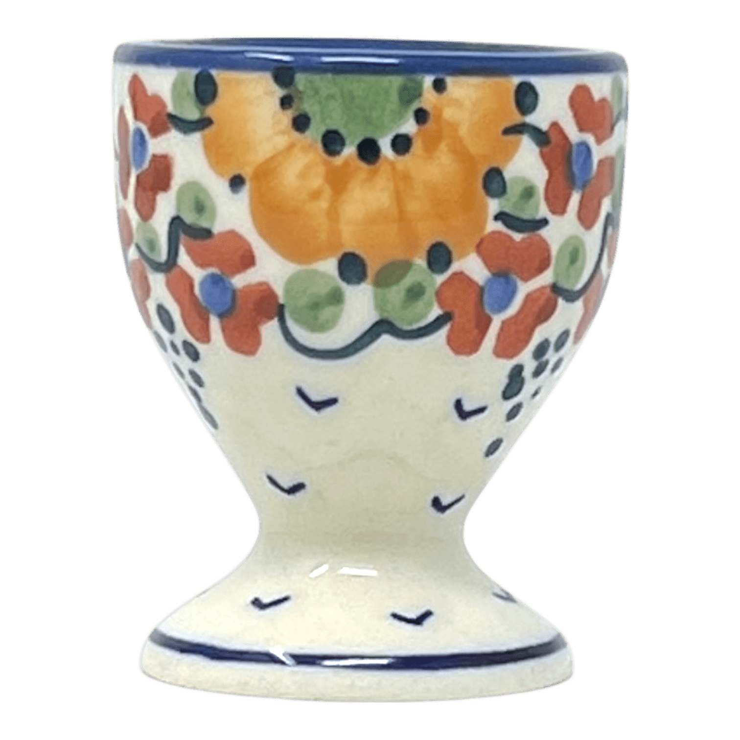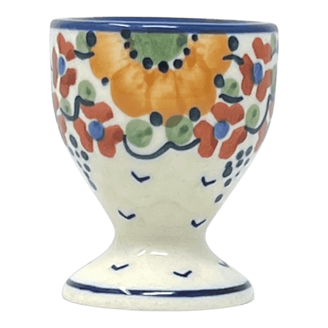 Imagine starting your day with a splash of artisan charm, cradling a soft-boiled egg in a Polish Pottery Egg Cup from Manufaktura. This isn't just any egg cup; it's a miniature masterpiece, adorned with the captivating "Autumn Harvest" pattern. Picture this: a delicate dance of flowers in rich golds, accented by serene whites and vibrant greens, all set against a crisp white background. Blue circumflexes scatter across the center, embraced by simple brown flowers with blue hearts, leading to a stunning band of large, detailed orange blossoms with green centers. It's a visual feast, perfect for adding a touch of elegance to your morning routine.