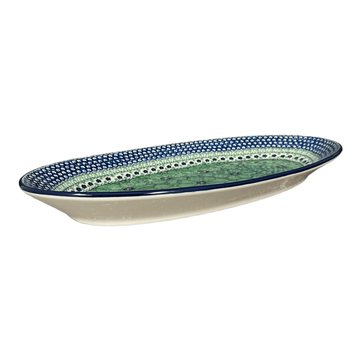 Imagine setting your table with an exquisite centerpiece that not only catches the eye but also tells a story of artistry and tradition. The Polish Pottery Platter, Oval, 17.5", CA (A200) by Ceramika Artystyczna, dressed in the mesmerizing "Green Goddess" pattern, is just that piece. This platter features a lush tapestry of large green flowers, encircled by delicate blue blossoms and swirling green and blue accents. Each element of the design is hand-painted by top-tier artists, who have reached the pinnacle of their craft, allowing them the honor of creating their own designs from scratch. These artists meticulously oversee each step of the production process, ensuring that every platter is a unique masterpiece bearing the prestigious "UNIKAT" stamp alongside the artist's signature.