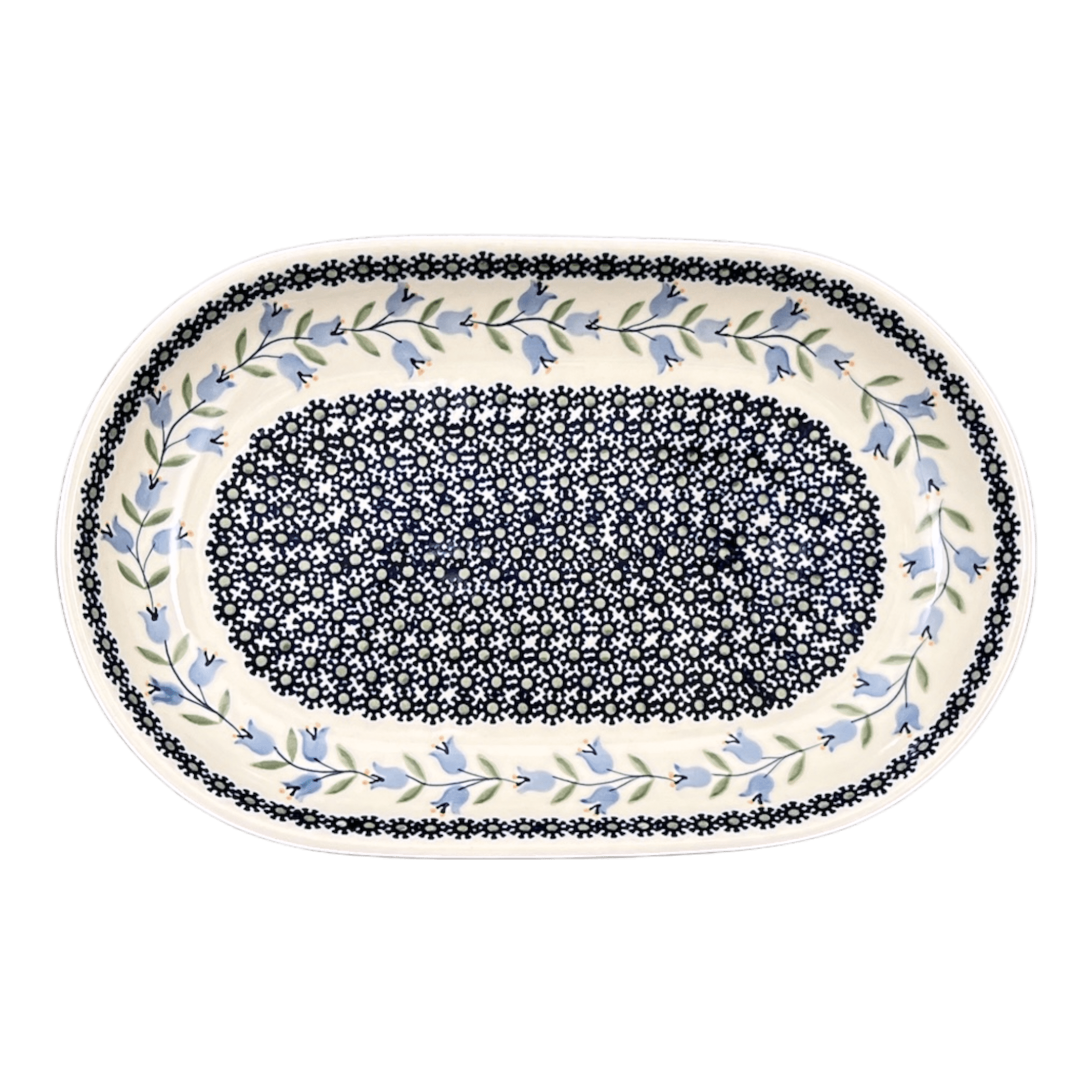 Each platter is a testament to the centuries-old craftsmanship of Polish pottery, hand-painted by skilled artisans in the historic town of Boleslawiec. The "Lily of the Valley" pattern features light blue bellflowers twining around a green vine, encircling the central blossoms like a delicate embrace. Utilizing the traditional "punching" technique, these artisans meticulously hand-stamp each piece, ensuring no two platters are exactly alike. This process not only celebrates the beauty of nature but also highlights the unique, personal touch that goes into creating every piece of Manufaktura pottery. Whether used for serving or as a decorative piece, this platter is a conversation starter, showcasing a blend of functionality and artistic expression.