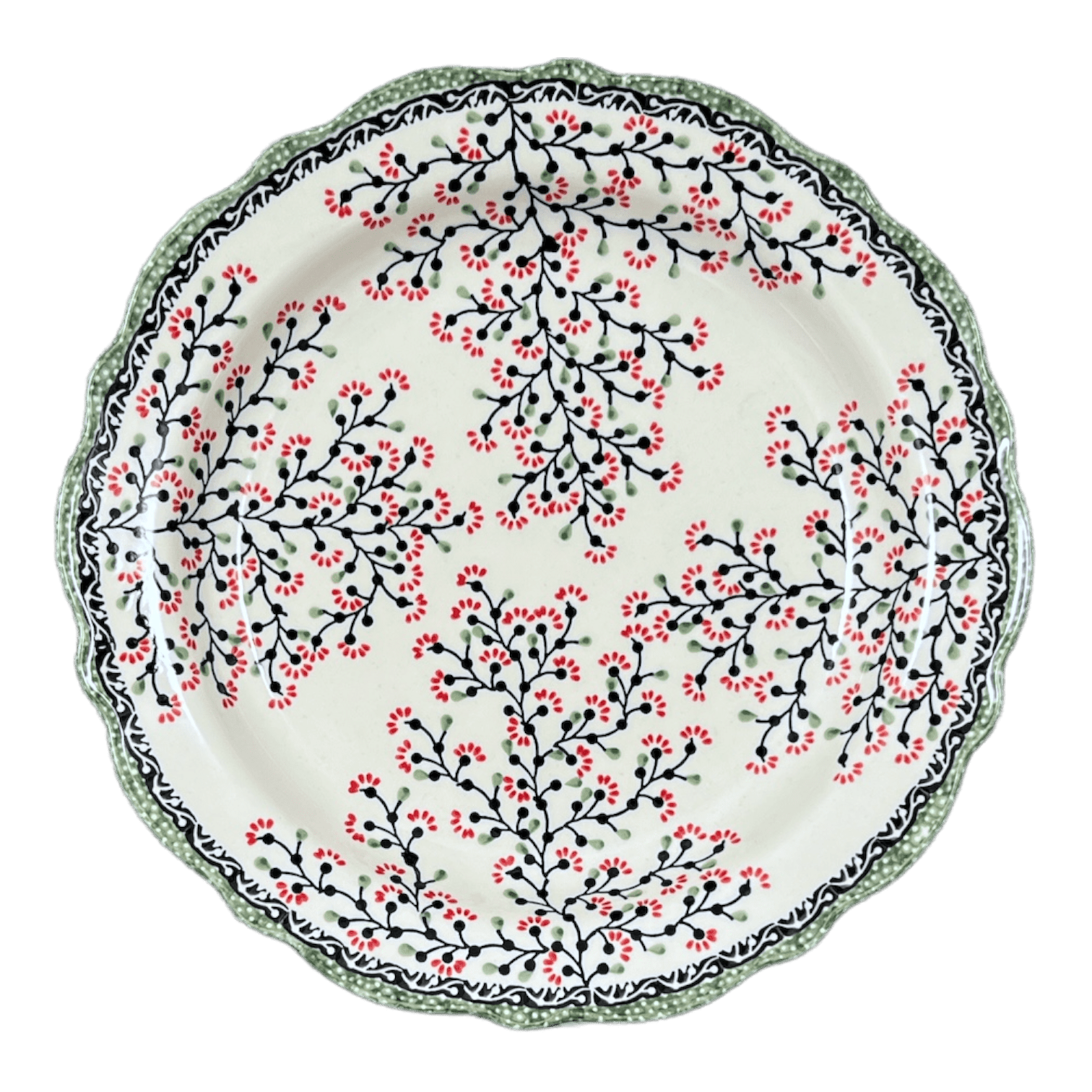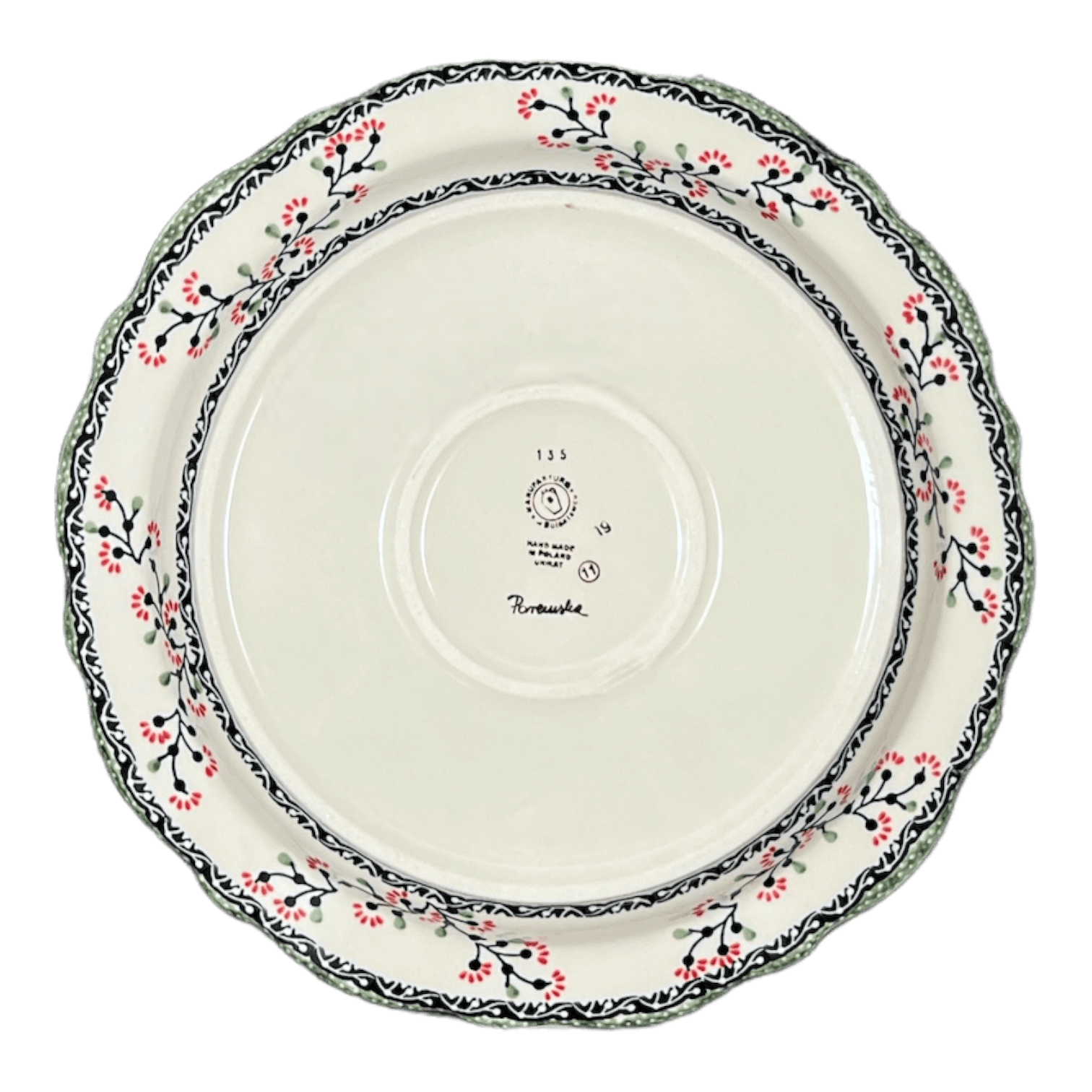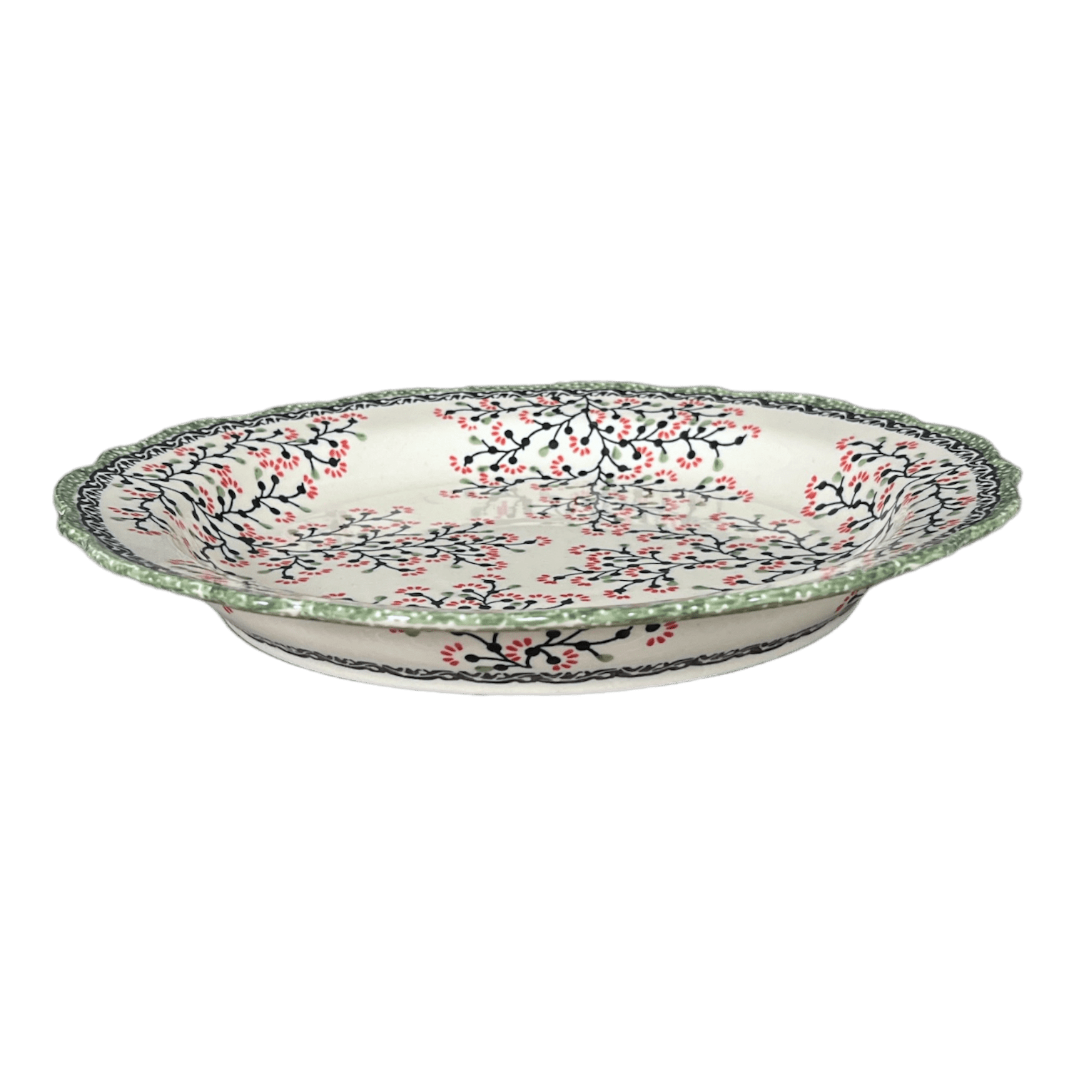 Imagine a masterpiece that not only captivates your guests with its beauty but also handles the hustle of everyday life with grace. Enter the Polish Pottery Platter from Manufaktura, a round ornate gem that spans 13.5 inches of pure artistic brilliance. Adorned with the exquisite "Cherry Blossoms" pattern, this platter features a mesmerizing dance of red blossoms twirling on black vines, set against a crisp white backdrop, edged with playful green dots. Each platter is a canvas displaying the height of craftsmanship, where every detail is painted by hand in Boleslawiec, Poland by skilled artisans renowned for their pottery prowess.