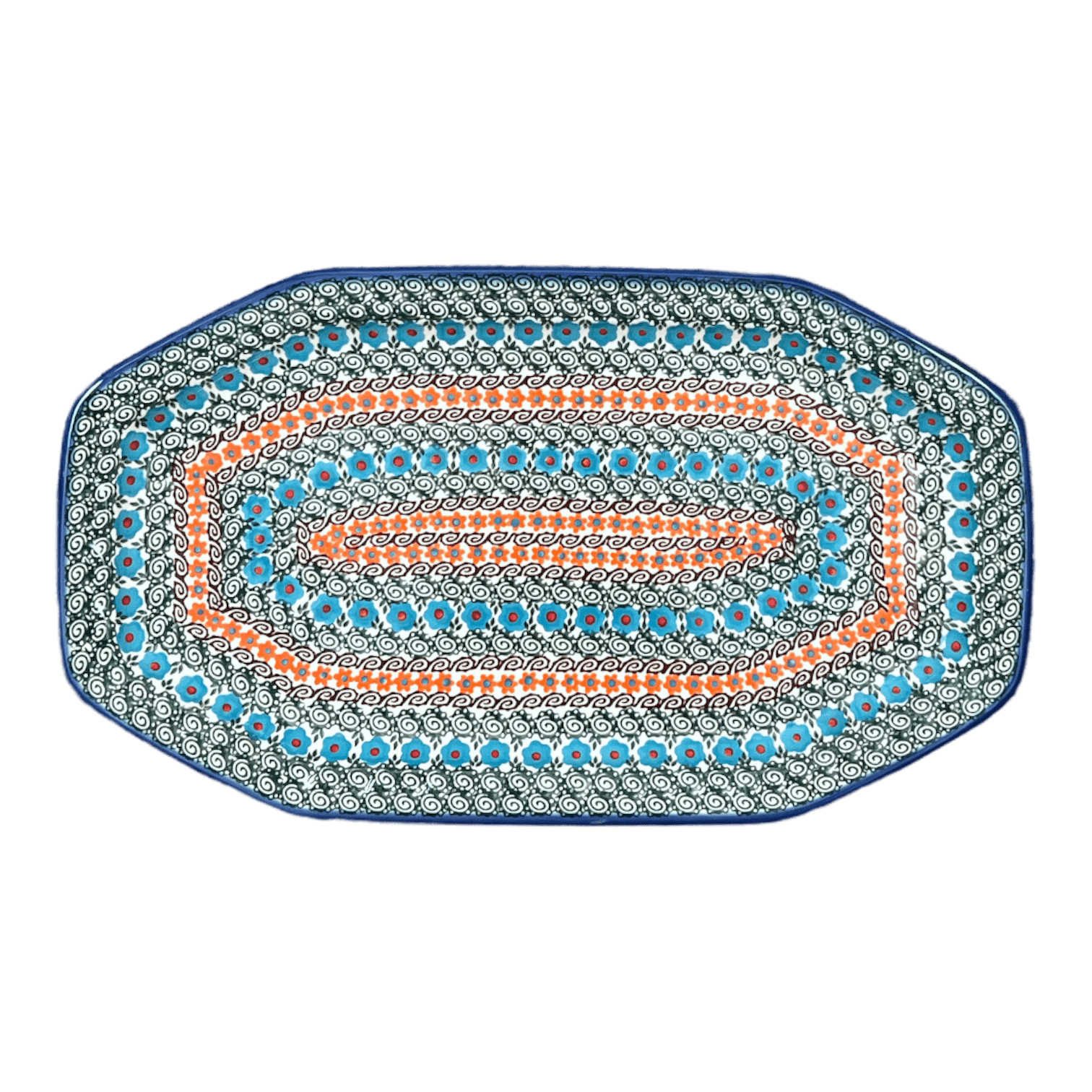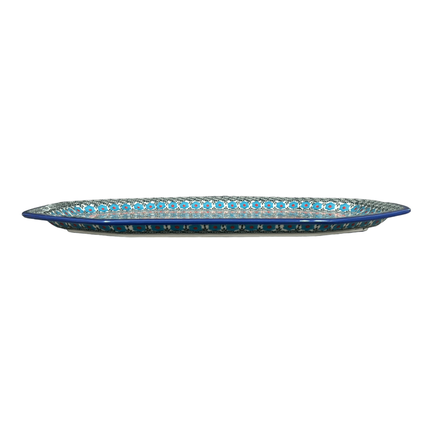 At the heart of this tray’s allure is the "Teal Pompons" pattern, which showcases rings of large teal flowers with bold red centers, gracefully alternating with petite orange blossoms and whimsical green spirals. This design reflects a traditional level of Polish pottery artistry, where simplicity meets elegance in a timeless dance. Crafted using the age-old "punching" technique, skilled artisans meticulously hand-stamp each detail, ensuring that no two trays are exactly alike. This unique variability means that each tray not only serves your guests but also tells a story of artistic endeavor and cultural heritage.