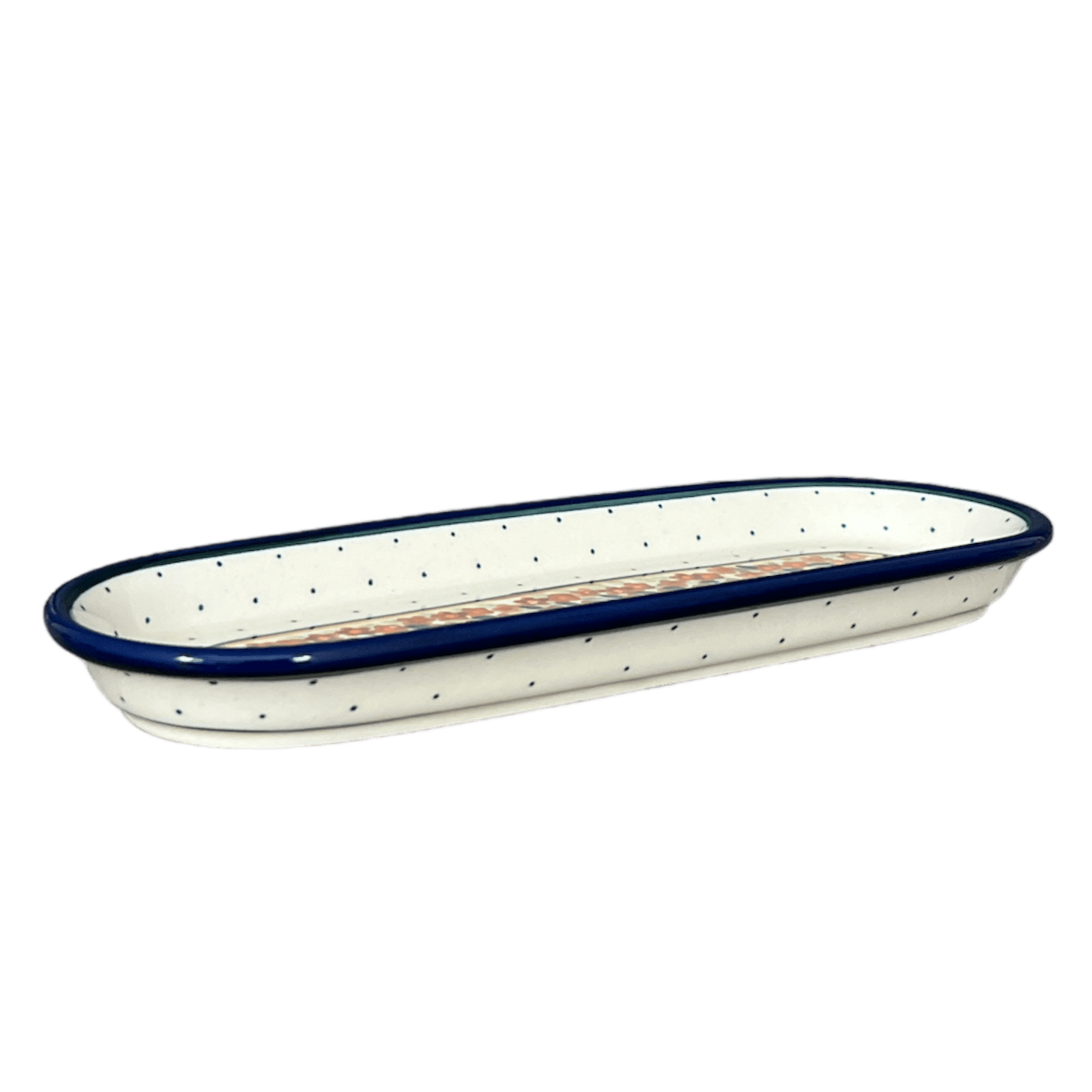 Step into a world where tradition meets elegance with the exquisite Polish Pottery Serving Dish, crafted by the master artisans of Zaklady in Boleslawiec, Poland. This oval marvel, measuring 11.25" x 4.5", is not just a dish but a piece of art adorned with the vibrant "Orange Wreath" pattern. Imagine a dance of flowers in rich hues of brown, orange, and gold, intertwined with lush green leaves, all encircling a pristine white center speckled with tiny, whimsical brown dots. This unique design is a testament to the Unikat level of artistry, a symbol of uniqueness where each pattern is a canvas displaying intricate details and a kaleidoscope of colors.