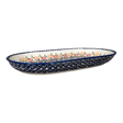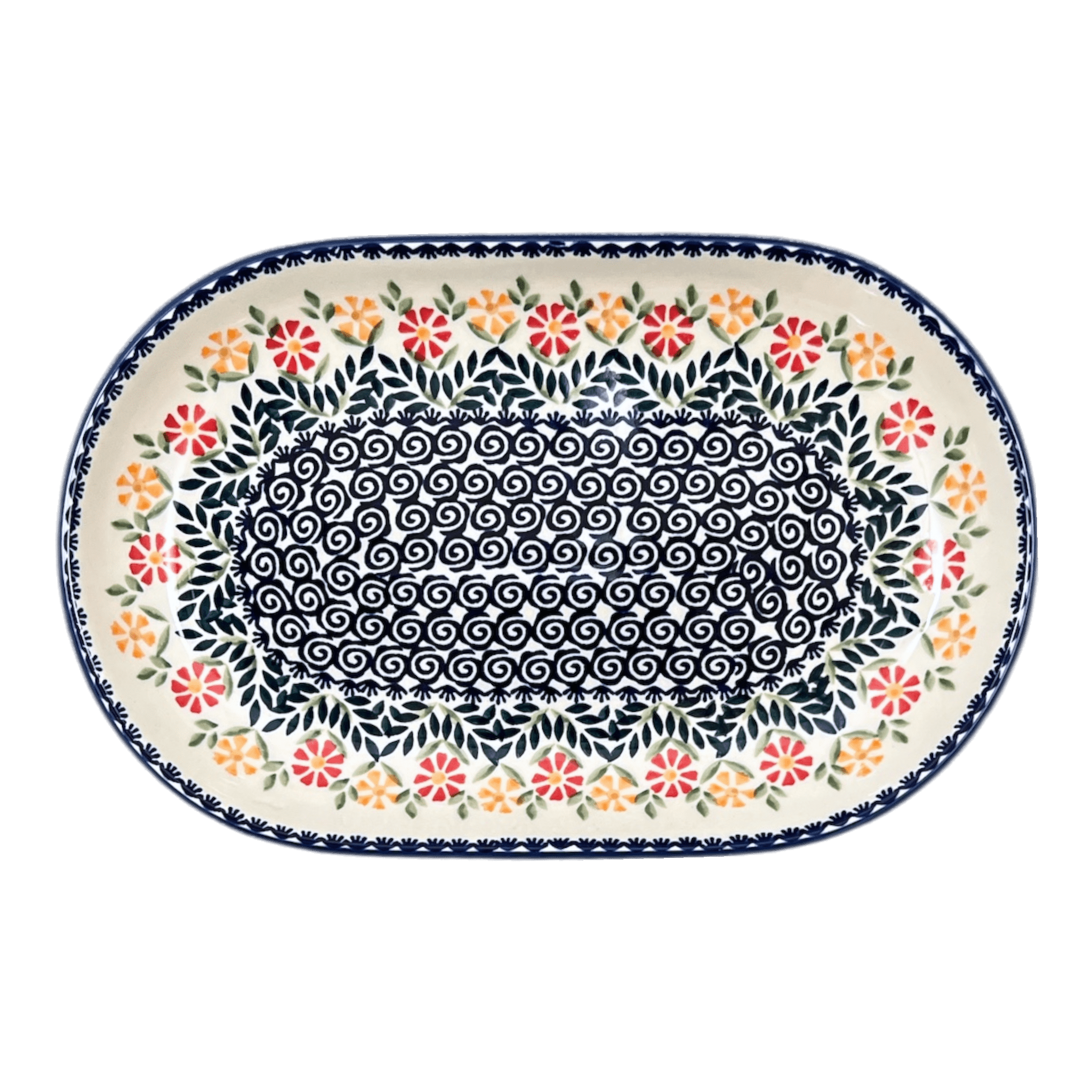 Imagine serving a vibrant feast on the breathtaking "Flower Power" Polish Pottery Platter by Manufaktura. This stunning 8" x 13" oval masterpiece isn't just a dish; it's the canvas for your culinary creations. Whether it's a steaming heap of spaghetti, a colorful array of salads, or even your signature calzones, this platter transforms every meal into a festive gala. With its rich reds, lively oranges, and soothing blues set against a crisp white background, the traditional "Flower Power" pattern brings the zest of Polish heritage right to your dining table.