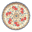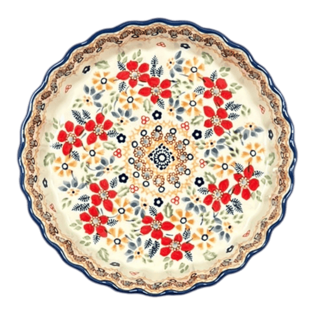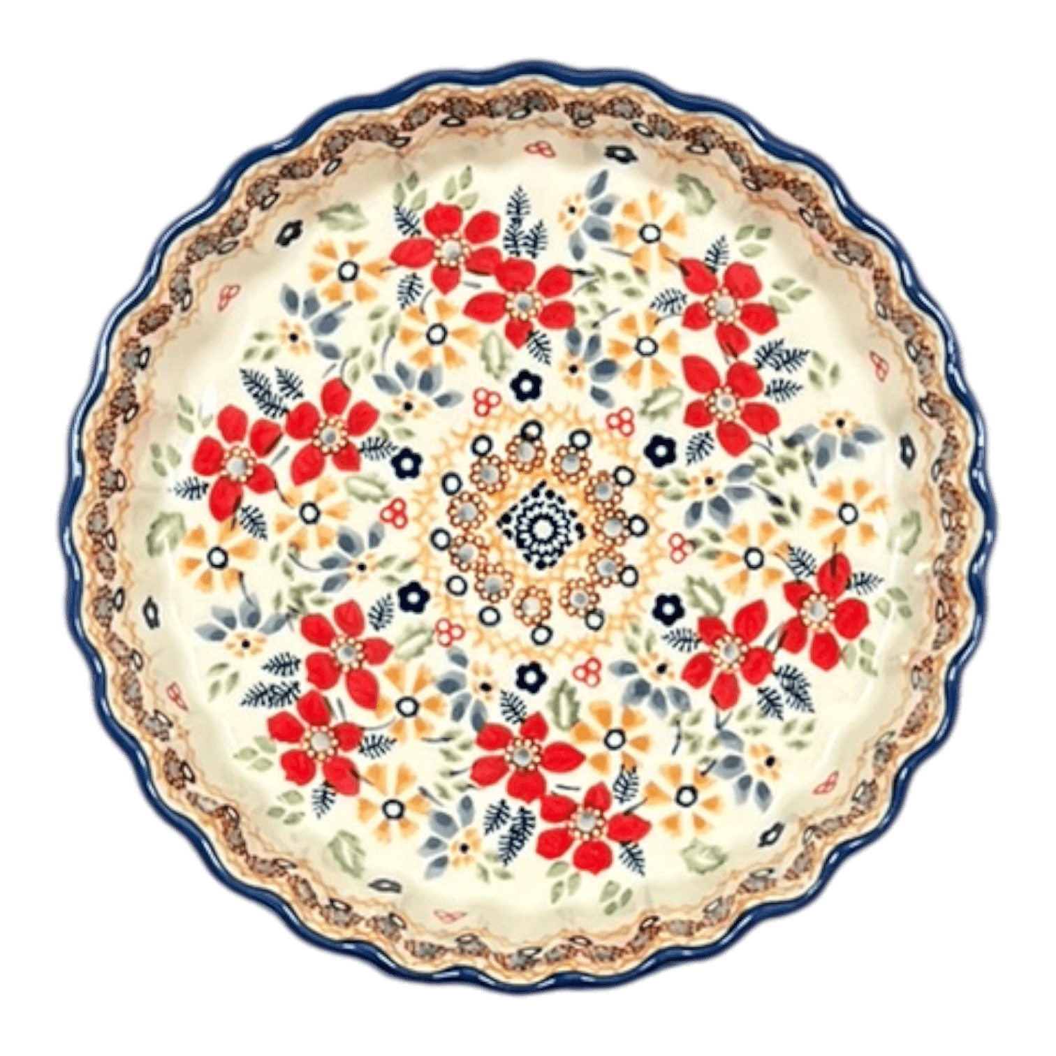 Introducing the enchanting Polish Pottery Quiche Dish from Manufaktura, a masterpiece that marries practicality with the charm of old-world craftsmanship. Measuring a quaint 7.5 inches in diameter, this small round dish is a gem in the "Ruby Duet" pattern—a design that bursts with the vibrancy of predominantly red flowers, accented with touches of gold, white, and blue. The central motif features a dense cluster of blue flowers, encircled by a lively chain of red, orange, and blue blooms. Hand-painted in the heart of Boleslawiec, Poland, this dish transforms every quiche into a festive celebration.