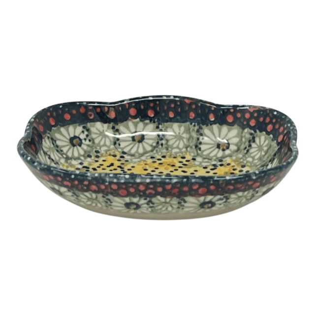 Imagine a piece so enchanting that it transports you directly to a whimsical world every time you glance its way! Enter the delightful, cloud-shaped Polish Pottery Dish from Manufaktura, measuring a charming 3" x 5". Handcrafted in the heart of Boleslawiec, Poland, this petite marvel is not just a dish but a portal to the playful "Sunshine Grotto" pattern. With its sun-kissed yellow backdrop and a whimsical dance of green and red floral accents, this dish turns any mundane corner into a cheerful celebration. Whether cradling your delicate jewelry, serving up your favorite dipping sauces, or safeguarding your precious soap bars, this dish ensures you're always on Cloud Nine!
