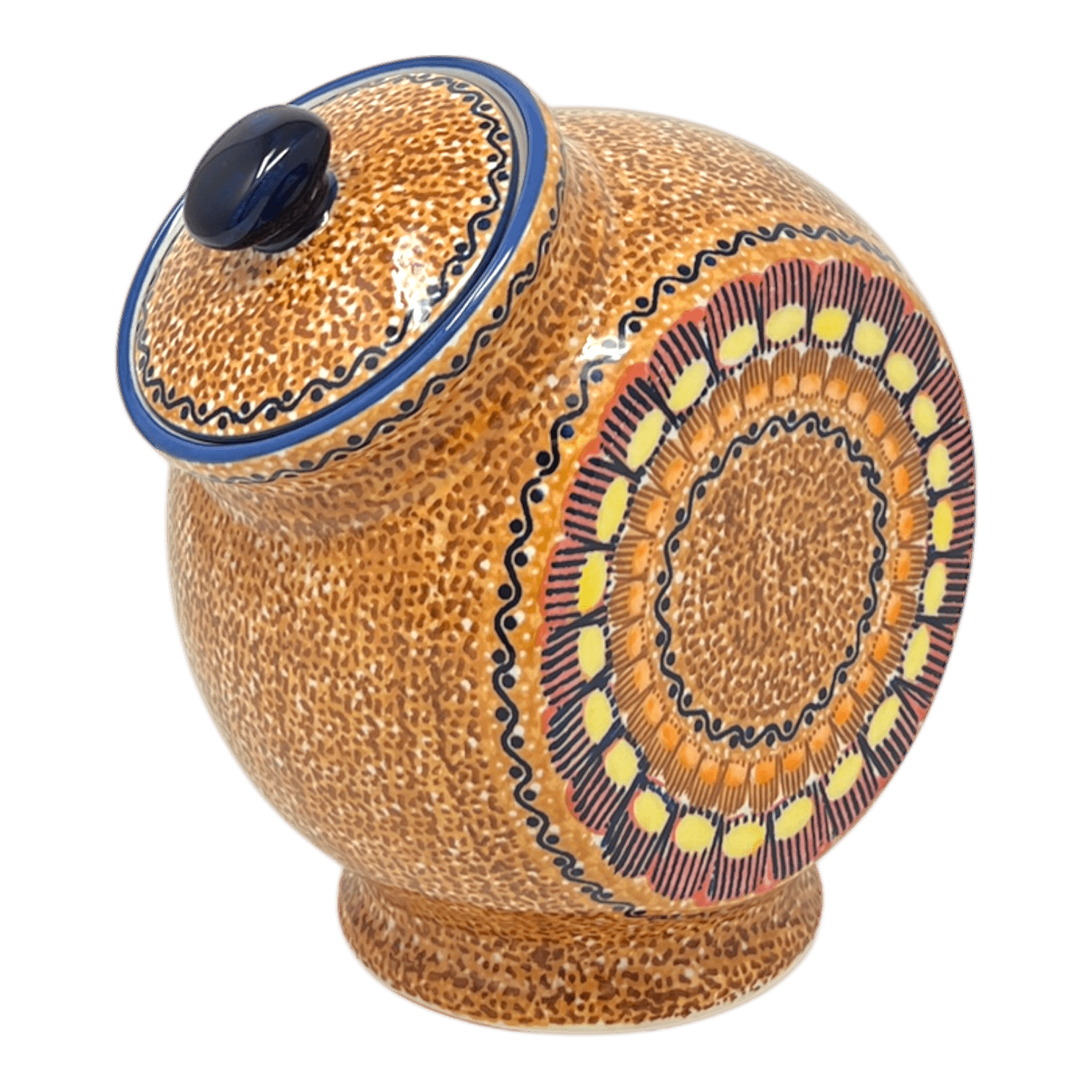 Step into a world where your sweet treats and secret snacks find a charming abode in the exquisite Polish Pottery Candy/Cookie Jar from Manufaktura. This isn't just any jar; it's a piece of art, meticulously crafted in the quaint town of Boleslawiec, Poland. The "Desert Sunrise" pattern that adorns this delightful container will transport you to a dreamy landscape at dawn, with its warm orange background and intricate design of tiny brown dots, surrounded by radiant bands of yellow and blue suns. The intricate details and vibrant colors showcase the exceptional Unikat level of artistry, a testament to the skill and creativity of the most experienced artisans. Each jar carries the unique "UNIKAT" stamp, promising exclusivity and a personal touch that turns storage into a display of fine art.