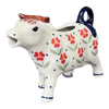 Introducing the charmingly whimsical Polish Pottery Creamer in the delightful "Poppy Garden" pattern (EJ01), crafted by the esteemed artisans at Manufaktura. This petite 4 oz creamer, adorned with vibrant flowers and a playful cow motif, promises to bring a splash of joy and a dollop of fun to your table! Imagine serving cream straight from this enchanting little bovine, a piece so lively it seems to moo with delight. The "Poppy Garden" design features an enchanting array of red poppies, accented by touches of blue, white, and green, dancing around a serene blue center. Each creamer is a testament to traditional craftsmanship, lovingly hand-painted in the historic town of Boleslawiec, Poland.