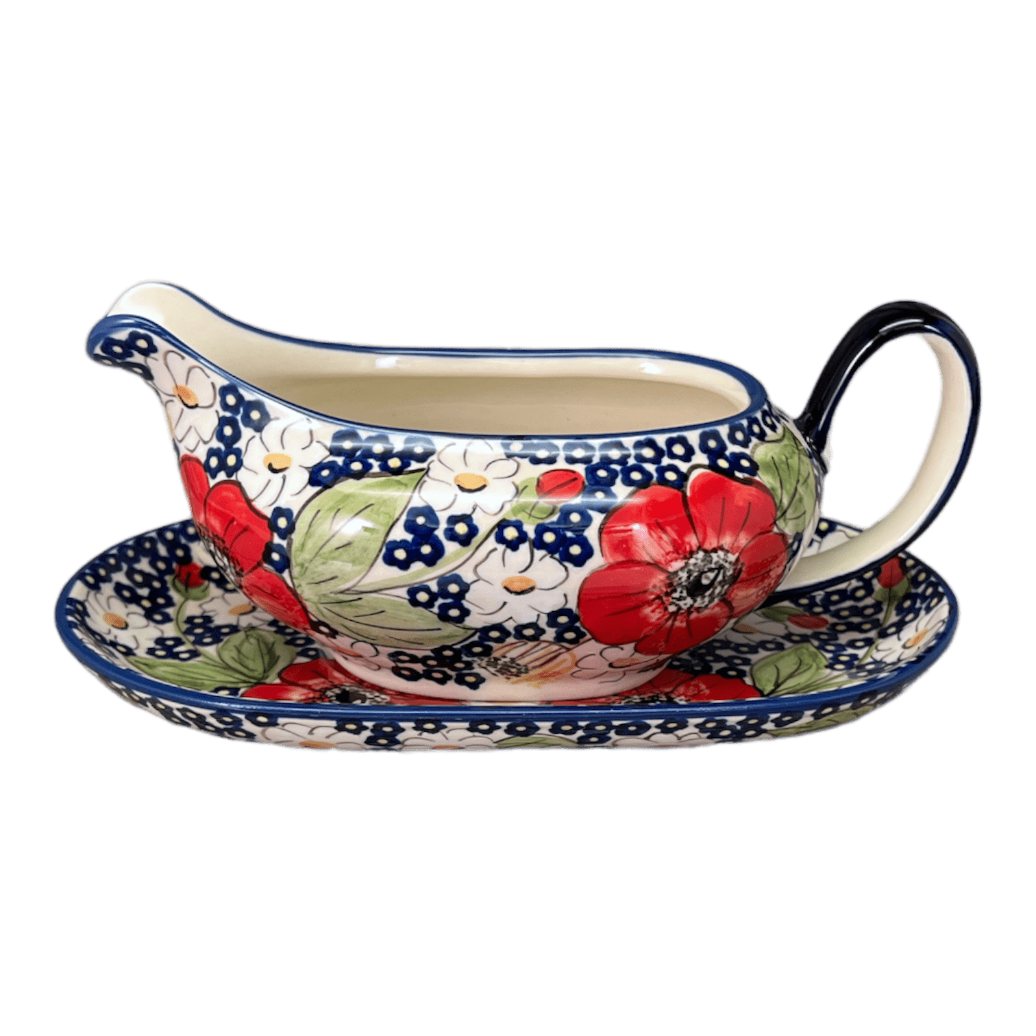 Introducing the stunning Polish Pottery 14 oz. Gravy Boat by Manufaktura, now available in the captivating "Poppies & Posies" pattern (IM02). This gravy boat is not your ordinary dining accessory - it is an elegant masterpiece that will elevate your dining experience to a whole new level. And the best part? It comes with its own saucer, adding an extra touch of sophistication to your table setting.
