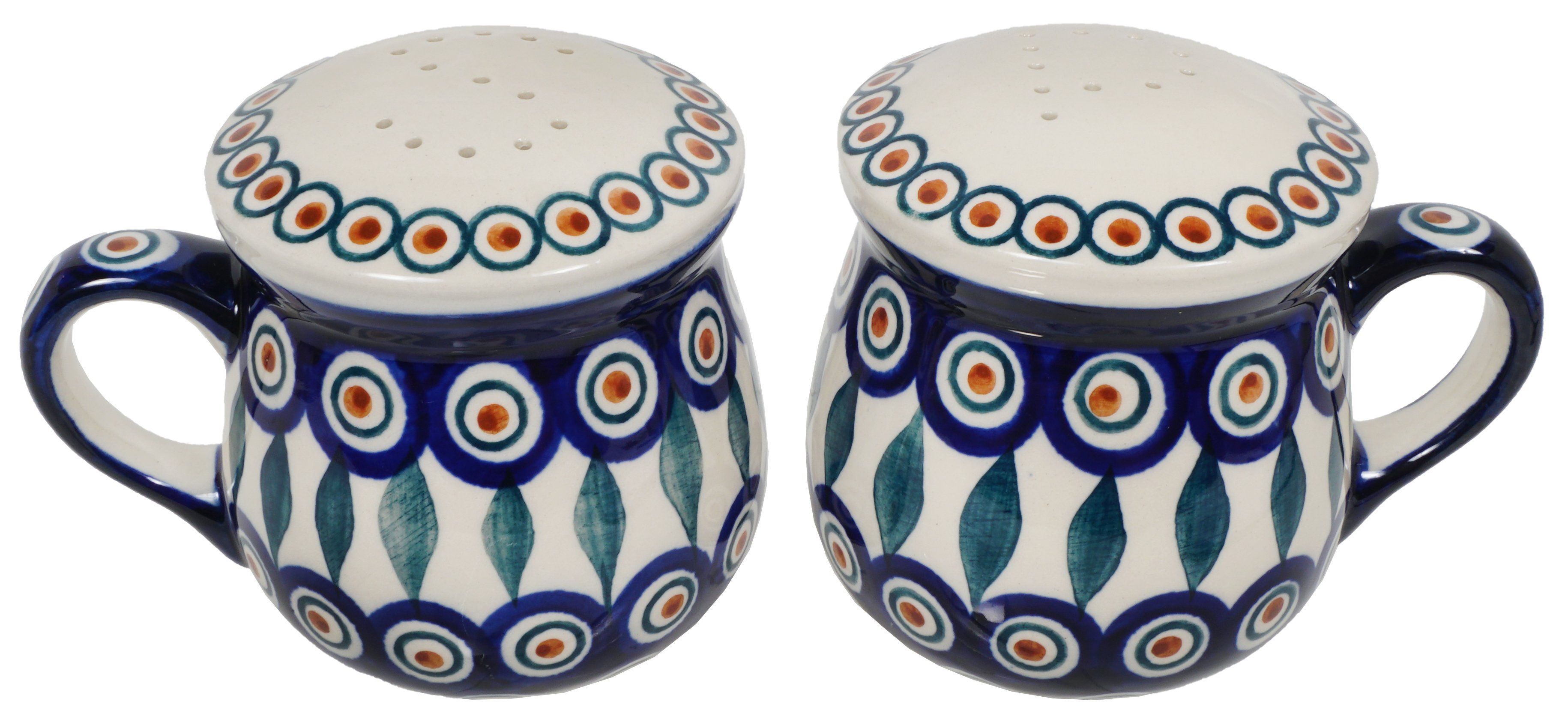 The "Peacock" pattern is a testament to the timeless beauty of traditional Polish pottery designs. Created using the intricate "punching" technique, skilled artisans hand-stamp each design inspired by the natural world around them. As a result, no two shakers are exactly alike; each bears the unique touch of the artist who crafted it. Standing at 4 inches tall, these shakers are not only a practical kitchen necessity but also a conversation starter, perfect for any collector or enthusiast of fine ceramics.