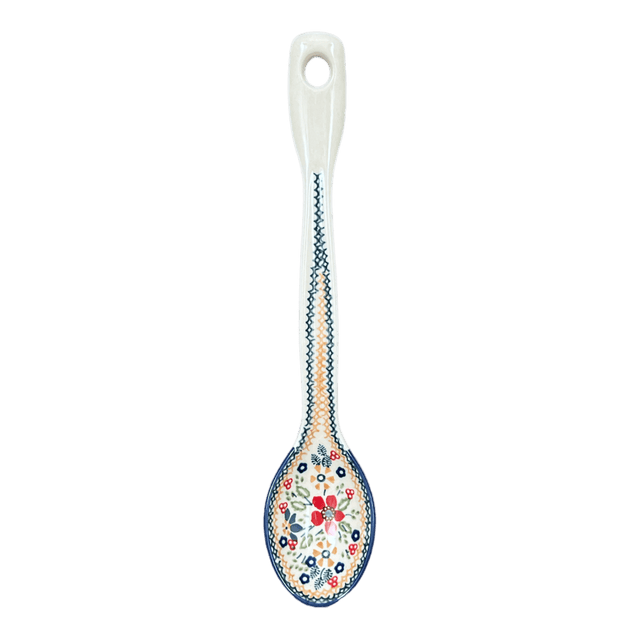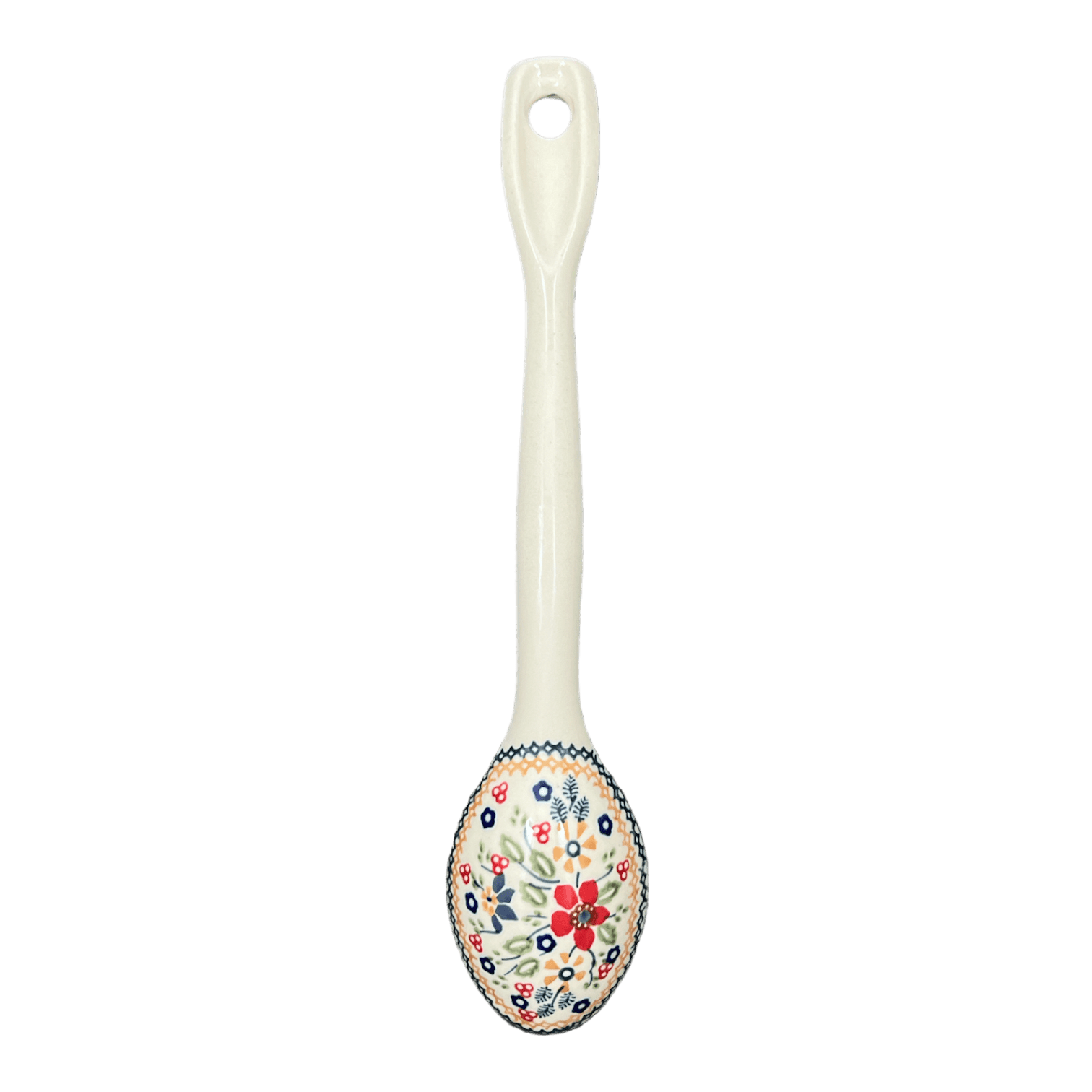 Imagine a kitchen where every stir and mix adds a splash of artistic flair! Meet the Polish Pottery Spoon from Manufaktura, your new favorite kitchen companion. At 12 inches long, this large stirring spoon is not just a utensil—it's a masterpiece. Hand-painted in the vibrant "Ruby Bouquet" pattern, it features a dazzling display of flowers in a symphony of red, accented with touches of blue, gold, and white. The white background is delicately adorned with tiny blue and small orange flowers, while a chain of blue blooms lines the edges, creating a visual feast that brings the art of Polish pottery right to your stovetop.