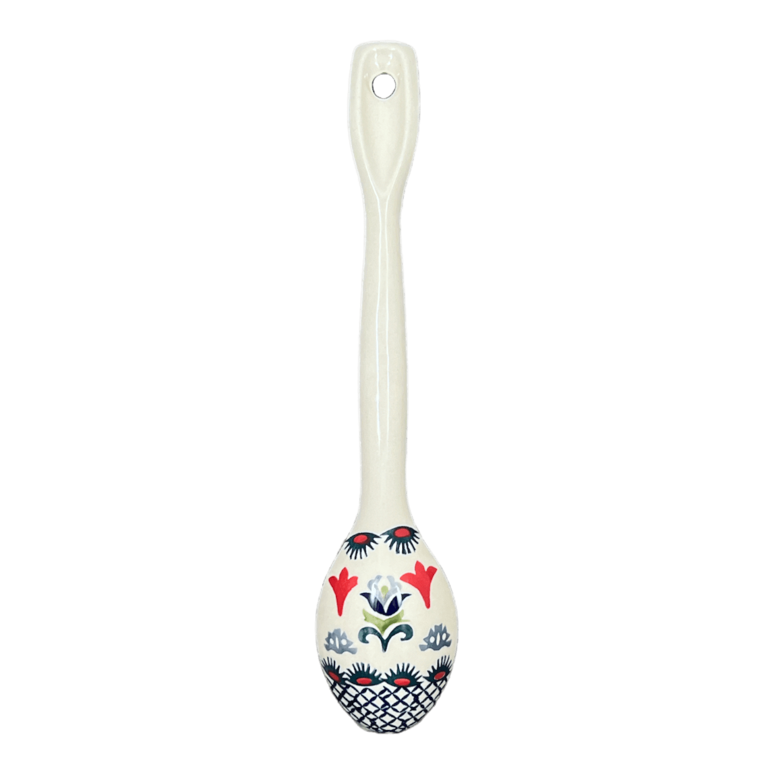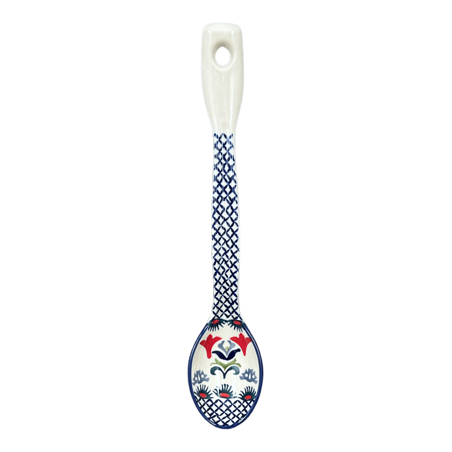 Introducing the exquisite Manufaktura Polish Pottery Spoon, a masterpiece of culinary artistry designed to add a splash of color and elegance to your kitchen. Crafted by the skilled artisans of Manufaktura in Boleslawiec, Poland, this 12-inch stirring spoon is not just a utensil but a piece of tradition, painted by hand in the vibrant "Scandinavian Scarlet" pattern. Imagine stirring your favorite dishes with a spoon that features a stunning geometric weave in a lively palette of blue, accented with pops of red, green, and white. The central design boasts a white background with an intricate blue geometric pattern, surrounded by bright red bellflowers and elegant blossoms in shades of teal, blue, and light blue, making every cooking experience a moment of beauty.