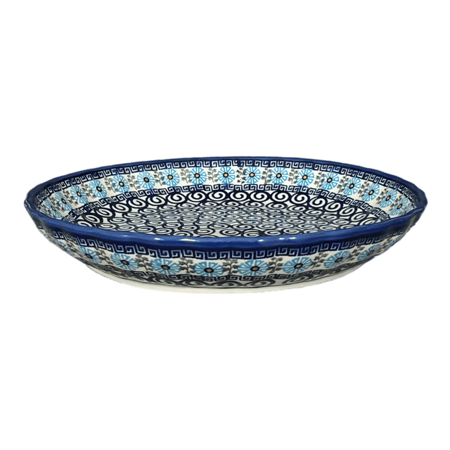 Introducing the stunning Polish Pottery Bowl from Andy's exquisite collection, where tradition meets a splash of modern artistry! Crafted in the heart of Boleslawiec, Poland, this 12.5" round, shallow bowl dazzles with its "Blue Daisy Spiral" pattern. Picture a dance of light blue flowers encircling a vibrant cluster of dark blue spirals, each detail lovingly hand-stamped by skilled artisans using the traditional "punching" technique. This delightful pattern, alive with hues of blue accented by whispers of white and green, captures the essence of a serene floral meadow, transforming every meal into a picturesque feast.