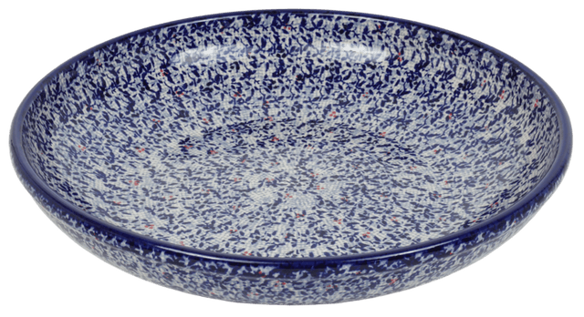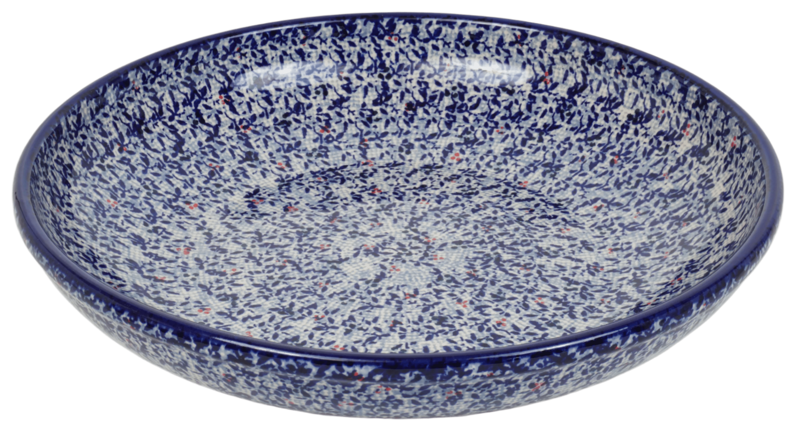 Introducing the exquisite "Twilight Berries" Polish Pottery Bowl from Manufaktura, a true masterpiece crafted in the heart of Boleslawiec, Poland. This shallow, round salad bowl spans a generous 11.75 inches in diameter, making it the perfect canvas for its breathtaking design. The "Twilight Berries" pattern, part of the exclusive Unikat line, features a delicate dance of leaf and berry motifs against a soothing light blue backdrop. Tiny blue leaves intricately sprawl across the surface, punctuated by playful sets of three tiny red dots, adding a touch of whimsy and charm to your dining experience. This pattern isn't just a design; it's a celebration of advanced artistry, showcasing the heightened skills of Manufaktura’s most esteemed artists.