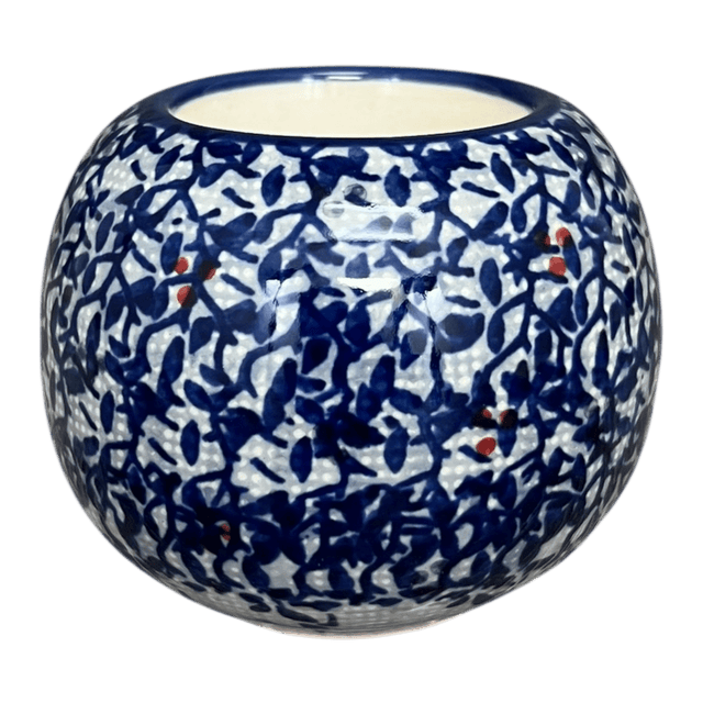 Imagine the soft glow of candlelight flickering across your dining table, casting playful shadows that dance with the vibrant hues of the "Twilight Berries" pattern. The Manufaktura Polish Pottery Candle Holder, a charming ball-shaped beacon of warmth, is not just any candle holder. It’s a piece of art handcrafted in the heart of Boleslawiec, Poland. Each one features a whimsical pattern with leaf and berry motifs set against a soothing light blue backdrop, dotted with tiny blue leaves and speckled with trios of petite red dots. This intricate design, painted with precision and care, embodies the unique artistry of the Unikat level, where each pattern is a testament to the skill and creativity of its maker.
