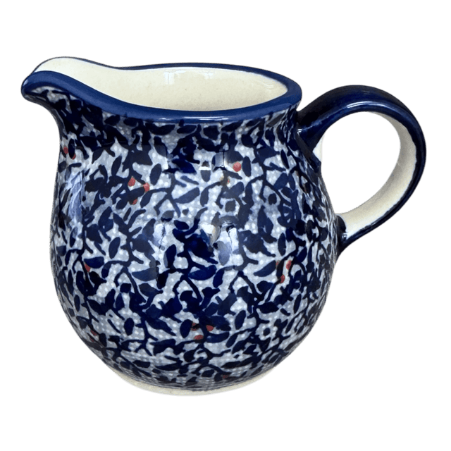 Introducing the enchanting "Basia" Polish Pottery Creamer from Manufaktura, a masterpiece that promises to elevate your table setting with its mesmerizing "Twilight Berries" pattern. Imagine drizzling your morning coffee with cream from this delightful 6.5 oz pitcher, adorned with a dance of tiny blue leaves and playful red dots scattered across a soothing light blue backdrop. Not just limited to cream, this versatile gem is perfect for serving milk, salad dressing, or any liquid concoction your heart desires. Handcrafted in the historic town of Boleslawiec, Poland, this creamer isn't just a kitchen accessory; it's a piece of art that brings a touch of heritage and charm to your home.