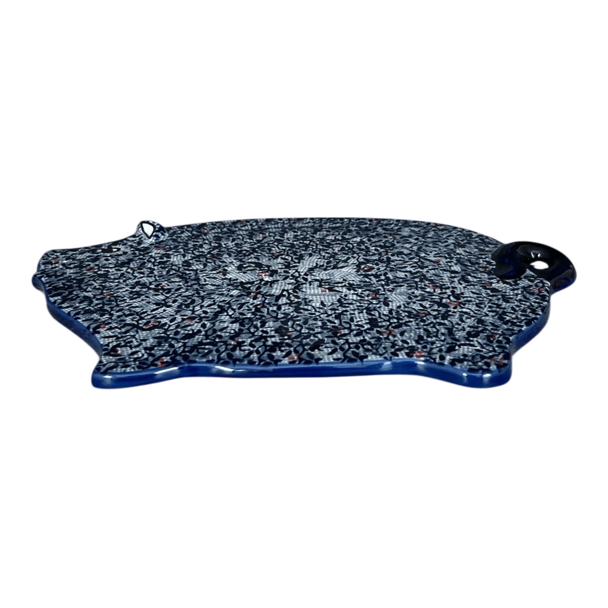 Introducing the enchanting "Twilight Berries" Polish Pottery Cutting Board from Manufaktura, where functionality meets whimsical charm! This delightful pig-shaped cutting board isn't just a tool; it's a conversation starter, perfect for slicing, dicing, or even serving your favorite appetizers. At 10.5 inches from snout to tail and 6.75 inches from foot to ear, its compact size and captivating design adorned with a light blue background, dense tiny blue leaves, and playful red dots make it a joy to use in the kitchen or display as a piece of art. Imagine this adorable piggy brightening up your kitchen counters or hanging quaintly on the wall when not in use, ready to lend a helping hand or simply make you smile.