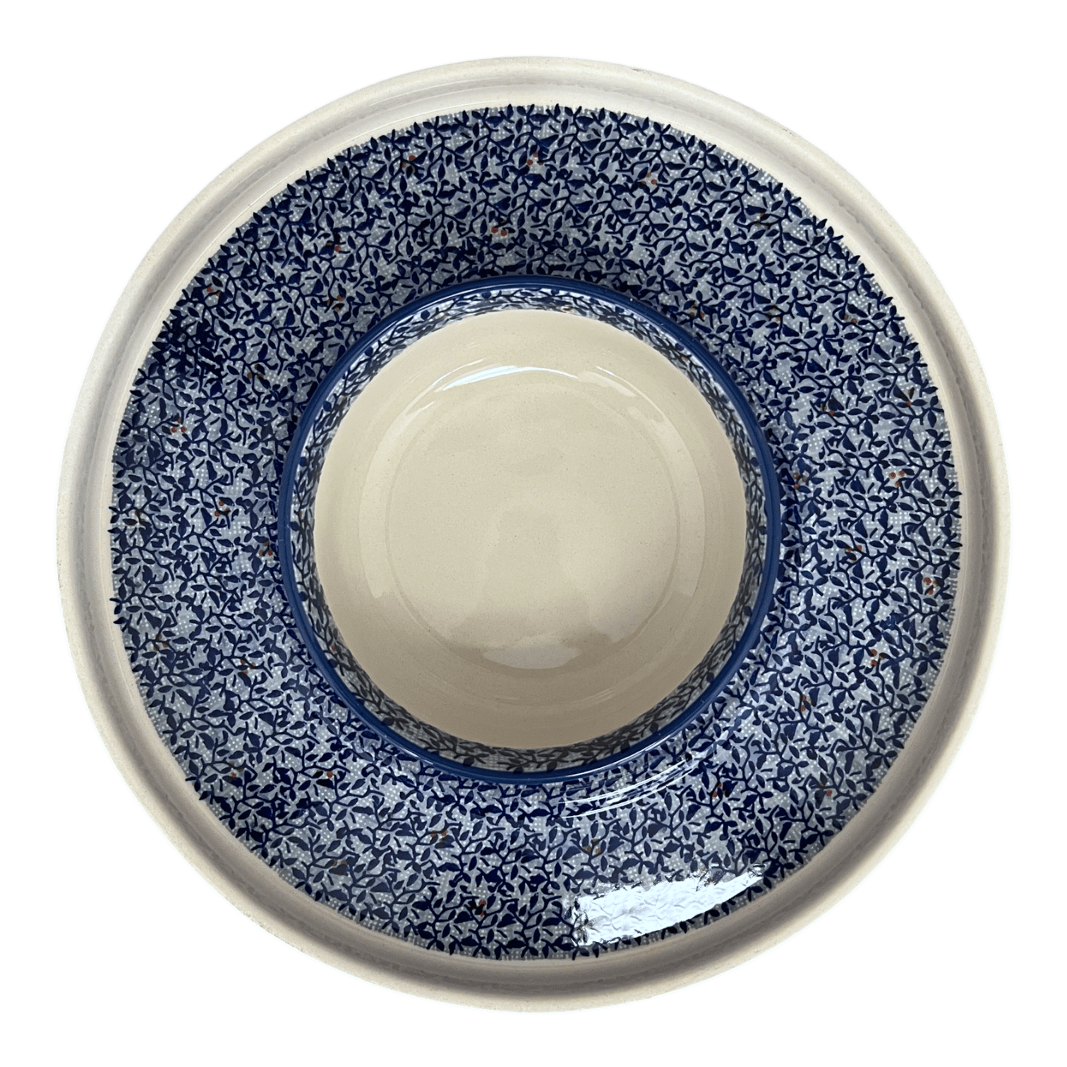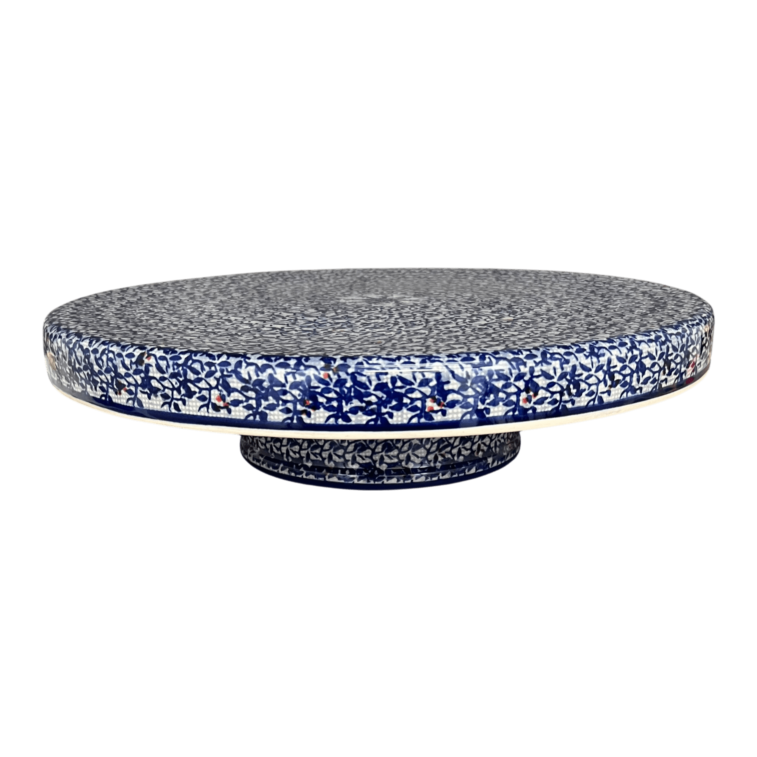Introducing the enchanting "Twilight Berries" Polish Pottery Platter by Manufaktura—a versatile masterpiece that effortlessly flips from a graceful cake plate to a functional chip and dip or hors d'oeuvres platter. Imagine the deep hues of twilight captured on a 12.75" canvas, where delicate leaf and berry motifs dance across a soothing light blue background. Tiny, intricate blue leaves blanket the design, punctuated by playful trios of tiny red dots, adding a whimsical contrast that's sure to catch the eye. This piece isn't just a platter; it's a portal to an artisan's dream, painted with a passion that promises to transform your table setting into a vibrant display of Polish craftsmanship.