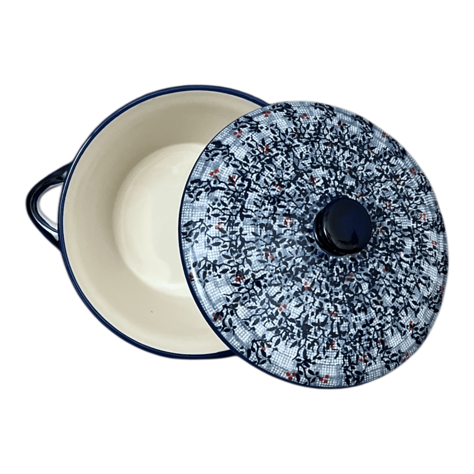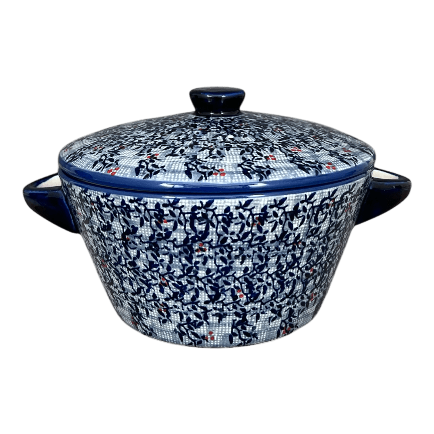 Imagine setting your dinner table with a piece that whispers tales of twilight orchards and artisanal charm. The Polish Pottery Soup Tureen in the enchanting "Twilight Berries" pattern, crafted by the renowned artisans at Manufaktura, does just that. This 1.25-quart masterpiece is not only perfect for serving your favorite hearty soups and stews but also doubles as an exquisite covered casserole dish. The unique design features a serene light blue background adorned with tiny, intricate blue leaves and playful sets of three tiny red dots, creating a dance of color and texture that brings the magic of a twilight berry field right to your table.