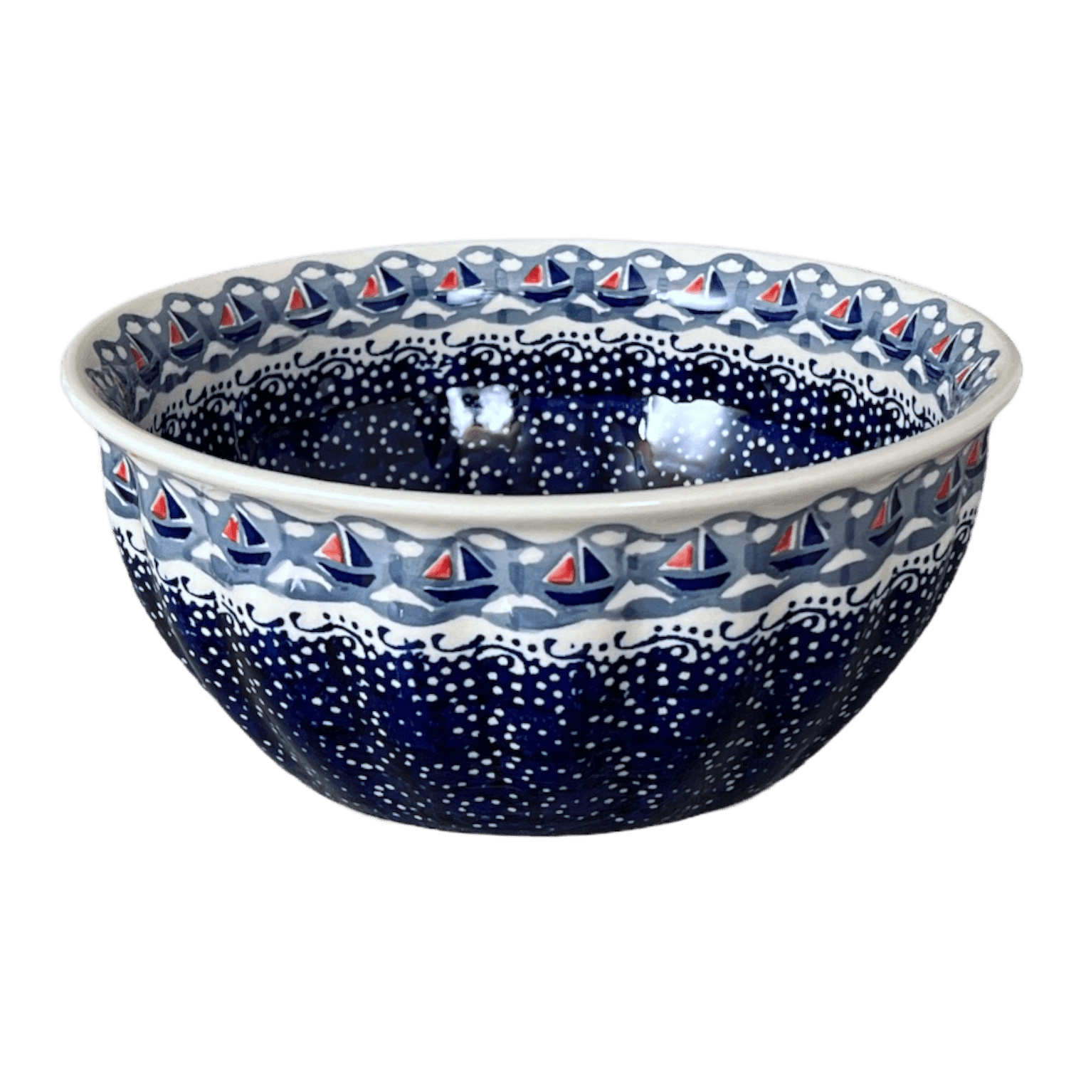Let's talk about the mesmerizing "Smooth Sailing" pattern that adorns this bowl. Picture a sea of blue, with elegant sailboats gliding through the waves. The predominantly blue design is accented with hints of white and gray, adding a touch of sophistication. The bowl itself features a white background with a bold one-inch border of red and dark blue sailboats, surrounded by gentle light blue waves. And if you look closely, you'll notice delicate pin-sized white dots scattered across the dark blue, forming perfect circles. It's a true work of art!