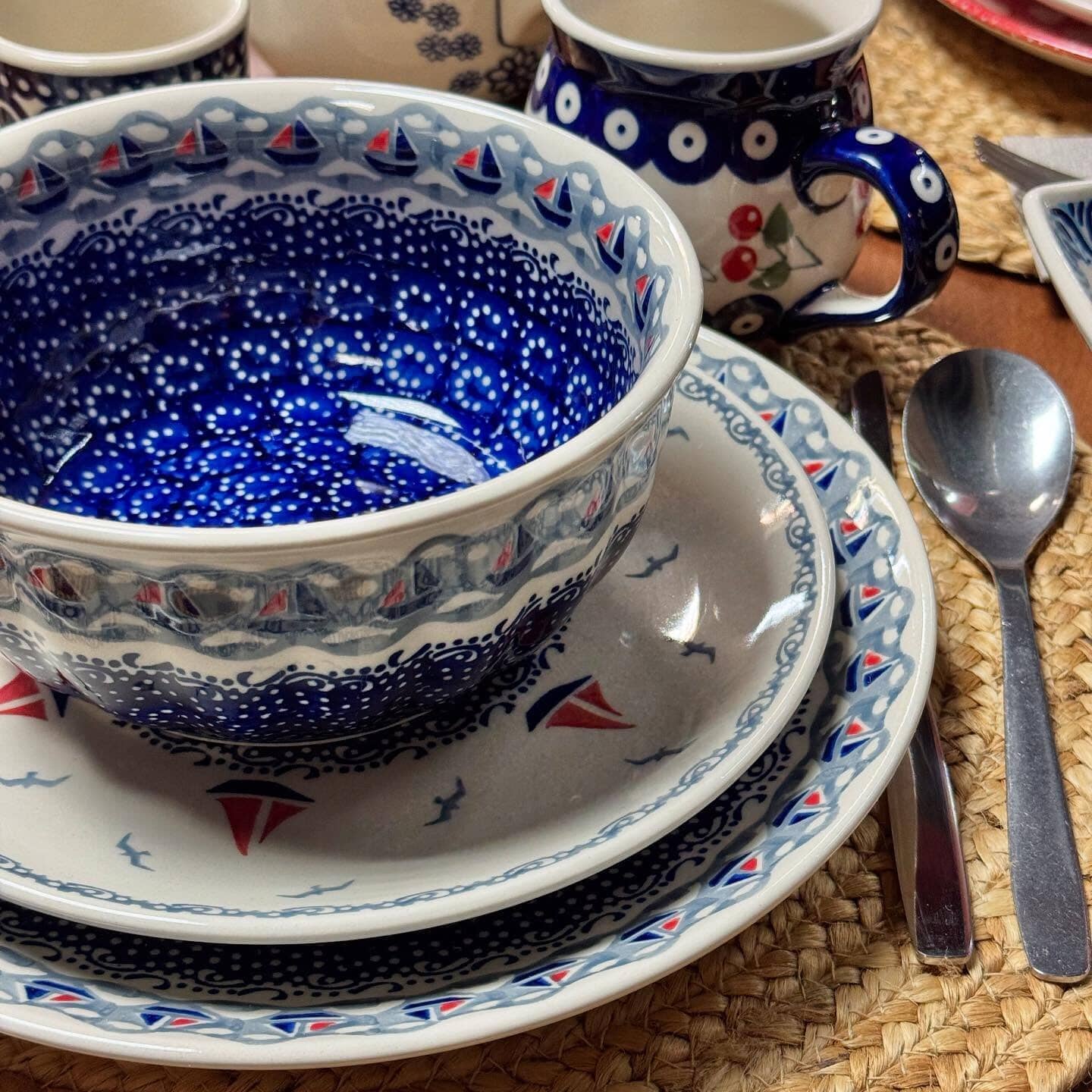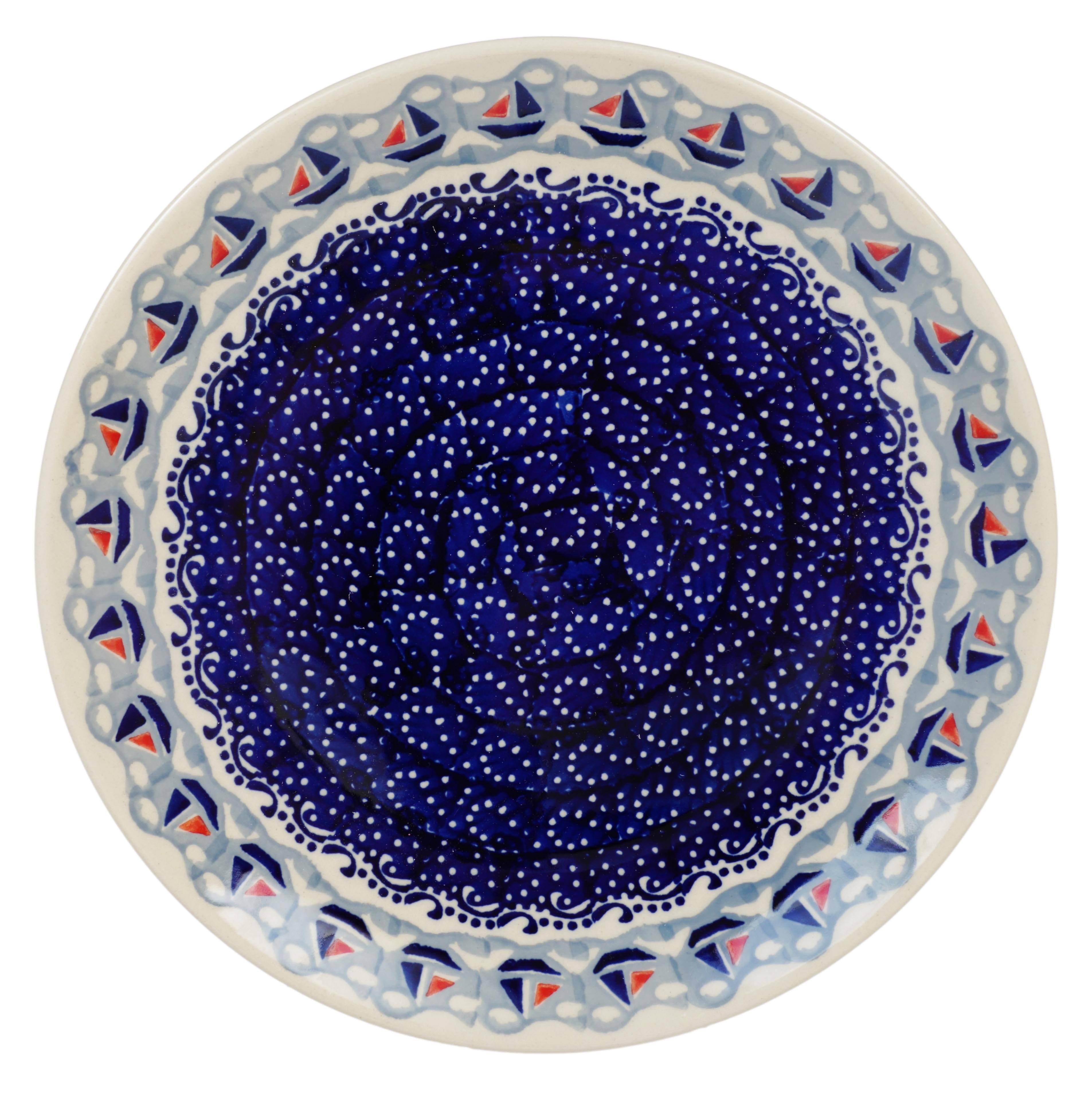 The "Smooth Sailing" pattern on this plate is a delightful spectacle, featuring charming dark blue sailboats that dance on light blue waves, encircled by a striking red border. The background of deep blue scattered with pin-sized white dots adds a whimsical touch of the ocean's endless sky. Each piece is hand-painted by highly skilled artisans using the traditional "punching" technique, making every plate a unique testament to the craft. Despite being categorized under Traditional patterns—known for their ubiquity and broad appeal—each rendition of "Smooth Sailing" carries its own distinct flair, thanks to the individual artist's touch.