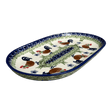 Imagine a kitchen where every meal is infused with a dash of art and a sprinkle of fun—that's exactly what the Polish Pottery Oval Roaster brings to your table! Crafted by the renowned artisans at Manufaktura in the vibrant "Chicken Dance" pattern, this 6" x 9" platter is not just a dish but a centerpiece of conversation. The delightful pattern showcases large brown chickens with whimsical green heads and teal blue tails, all prancing counterclockwise on a crisp white background dotted with light blue flowers. It's a festive scene that promises to turn every meal into a special occasion.