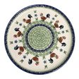 Imagine a piece of art so lively it makes every meal a little celebration. Enter the Polish Pottery Tray, Round 10.25", lovingly crafted by Manufaktura in the whimsical "Chicken Dance" pattern. This isn't just any tray; it's a stage where large brown chickens with green heads and teal blue tails strut their stuff against a charming backdrop of green grass and light blue flowers. The vibrant scene, set on a crisp white background, seems to come alive with each glance, turning what could be a mundane dinner into a delightful visual feast. The shallow, rimmed design not only makes it versatile for various uses but also beautifully showcases this unique Unikat pattern—where the artistry level soars as high as the chickens' dance.