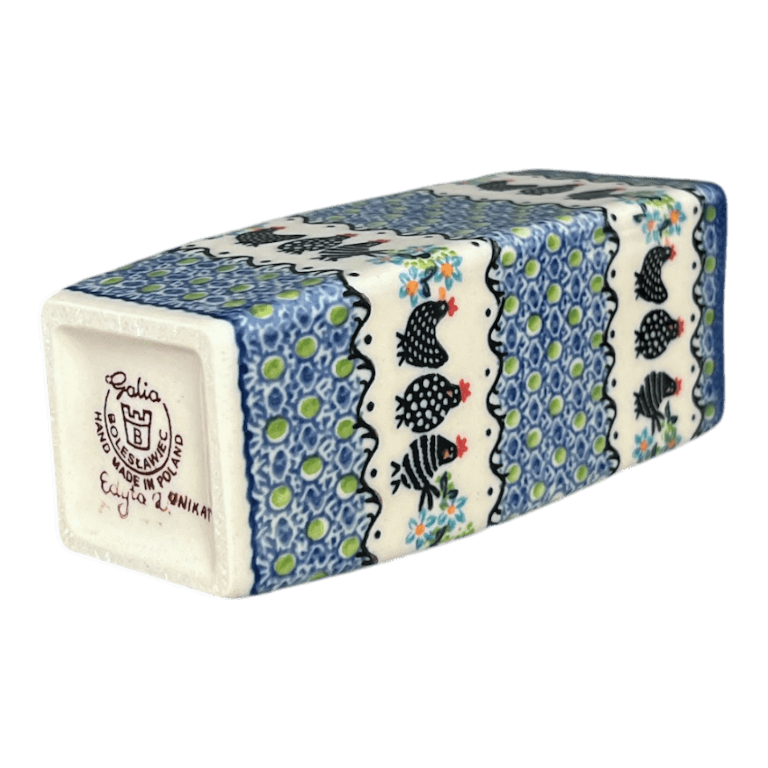 Step into a world of unique artistry with the Polish Pottery Vase from Galia, a treasure that captures the essence of rural charm and sophistication in its "Henning Around" pattern. Imagine a quaint countryside where chickens roam freely, depicted in striking blue hues with playful accents of black, teal, and red. This isn't just any vase; it's a centerpiece of conversation, featuring a delightful ring of black hens complemented by intricate blue flowers and vibrant dots. Crafted in the historic town of Boleslawiec, Poland, each vase is a testament to the skill and creativity of the artisans who bring these vivid scenes to life.