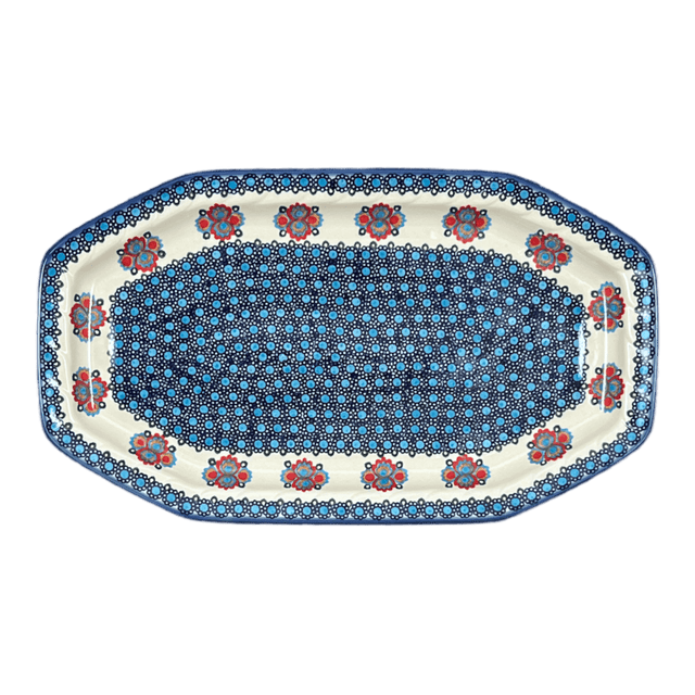 Introducing the enchanting "Polish Bouquet" Angular Tray by Andy, a masterpiece of culinary artistry straight from the heart of Boleslawiec, Poland. Measuring an impressive 10.5" x 18.5", this tray isn’t just a serving piece—it's a conversation starter. Whether it's a charcuterie spread for a cozy gathering or an elegant display of appetizers at a grand dinner party, this tray is designed to impress. Hand-painted with a delightful mix of blue hues and accented with vibrant reds and light blues, it brings the traditional charm of Polish pottery right to your table.