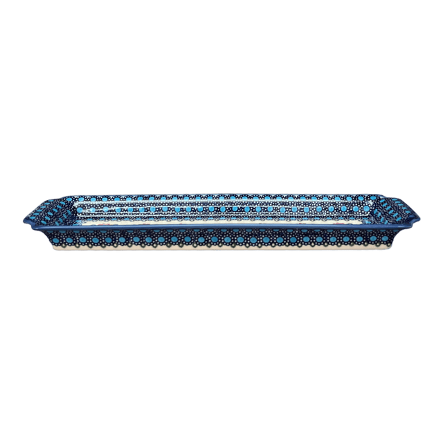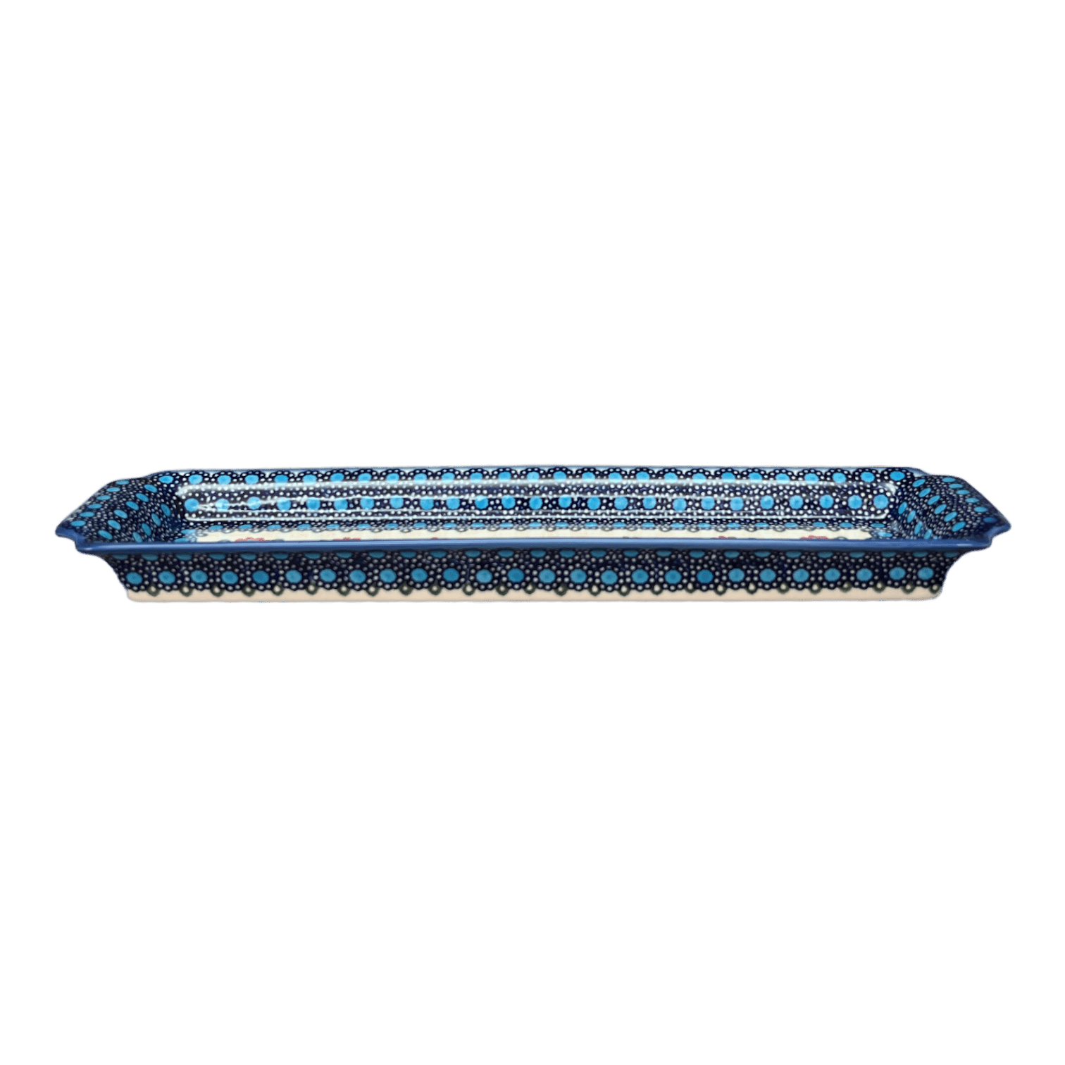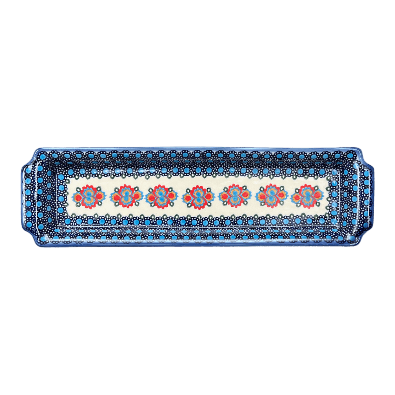 Imagine a tray that does more than just serve your favorite appetizers; it adds a splash of artistic charm to your table! Meet the Polish Pottery Tray, a stunning piece of craftsmanship that marries functionality with flair. Hand-painted in the vibrant "Polish Bouquet" pattern by the talented artisans at Andy's workshop in Boleslawiec, Poland, this tray features an enchanting array of flowers and dots in a predominantly blue palette, highlighted with touches of light blue and red. At 16" x 4.5", it's the perfect size for lining up bread, cheese and crackers, or a selection of desserts for your next gathering.