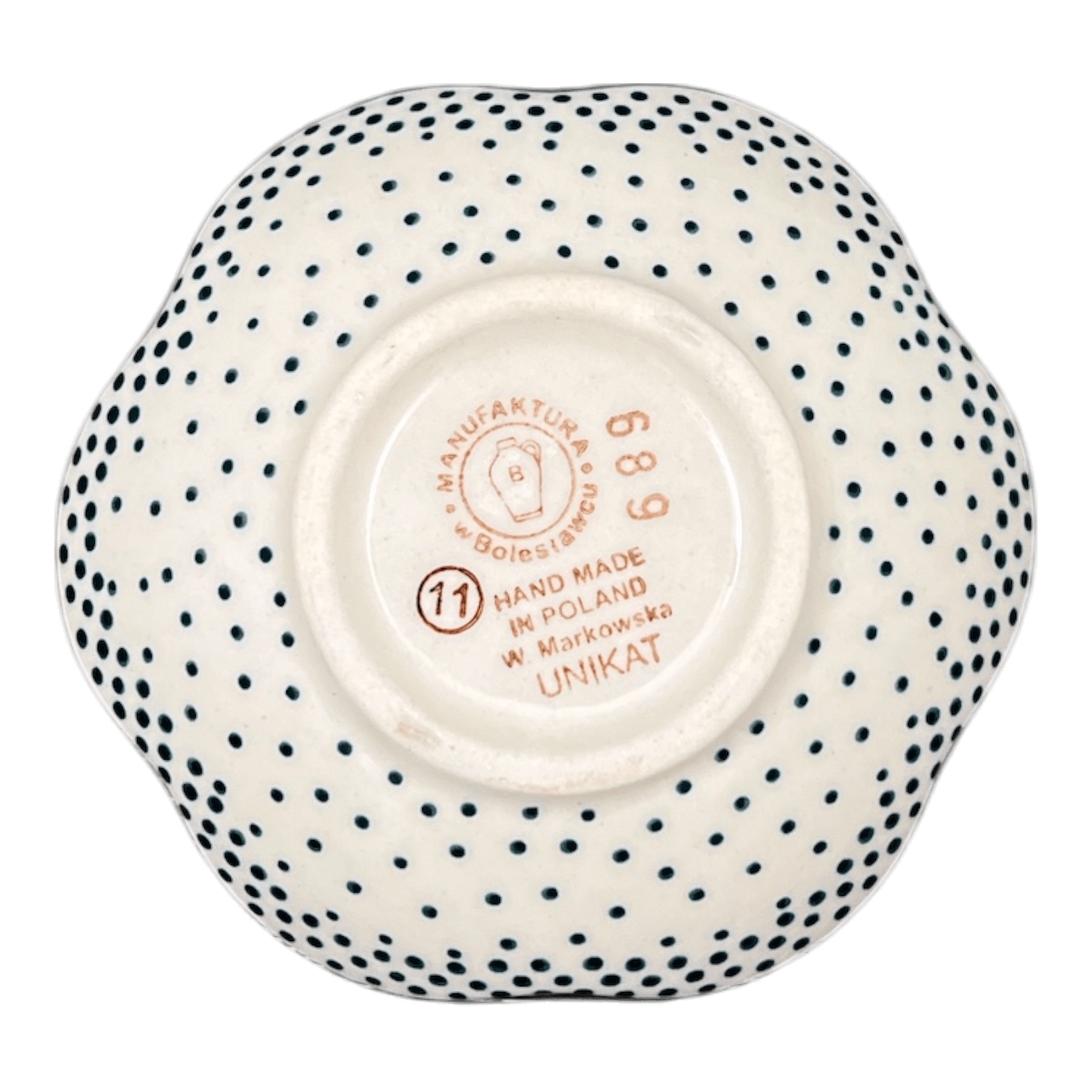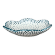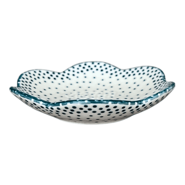 Discover the charm and elegance of the Polish Pottery Bowl, a delightful addition to your home decor. Crafted by the skilled artisans of Manufaktura in the picturesque town of Boleslawiec, Poland, this shallow, scalloped bowl dazzles with its "Misty Green" pattern. The design features a serene white backdrop sprinkled with tiny green dots, bordered by a dotted green rim that adds a whimsical touch. At a cozy size of 4.25 inches wide and 1 inch tall, this bowl is perfect as a jewelry dish, a unique candle holder, or simply as an eye-catching piece on your bookshelf. Its versatile design and compact dimensions make it an ideal candidate to beautify any corner of your home.