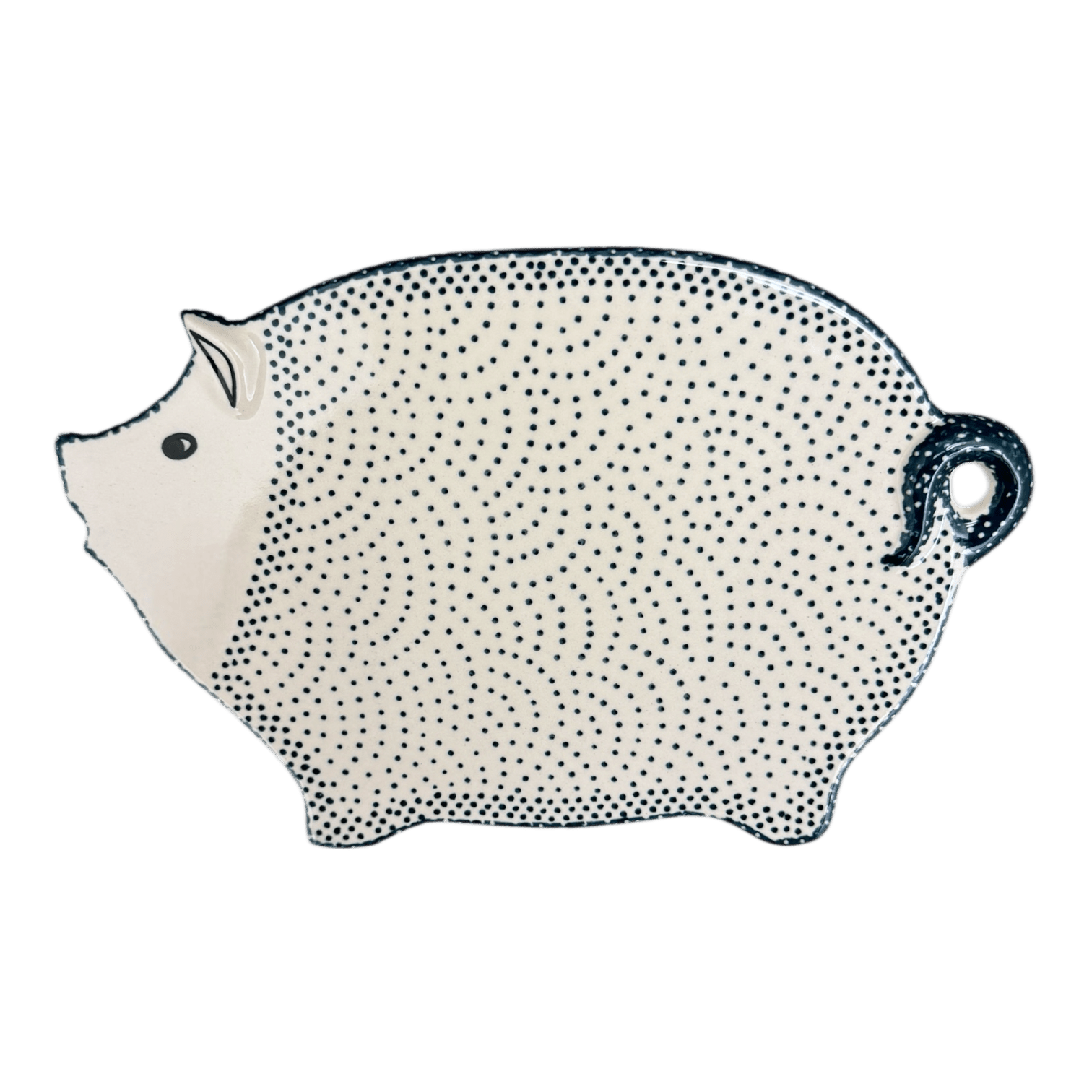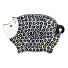 Introducing the enchanting Polish Pottery Cutting Board from Manufaktura, shaped adorably like a piggy and adorned in the mesmerizing "Misty Green" pattern. This whimsical board measures a convenient 10.5" from snout to tail and 6.75" from foot to ear, making it the perfect size for both chopping veggies and serving up charcuterie. Hand-painted in Boleslawiec, Poland, by skilled artisans, each board boasts a unique design of tiny green dots scattered across a pristine white background, framed by a dotted green rim. The exquisite detail and vibrant colors are a testament to the Unikat level of artistry—a mark of true craftsmanship and rarity.