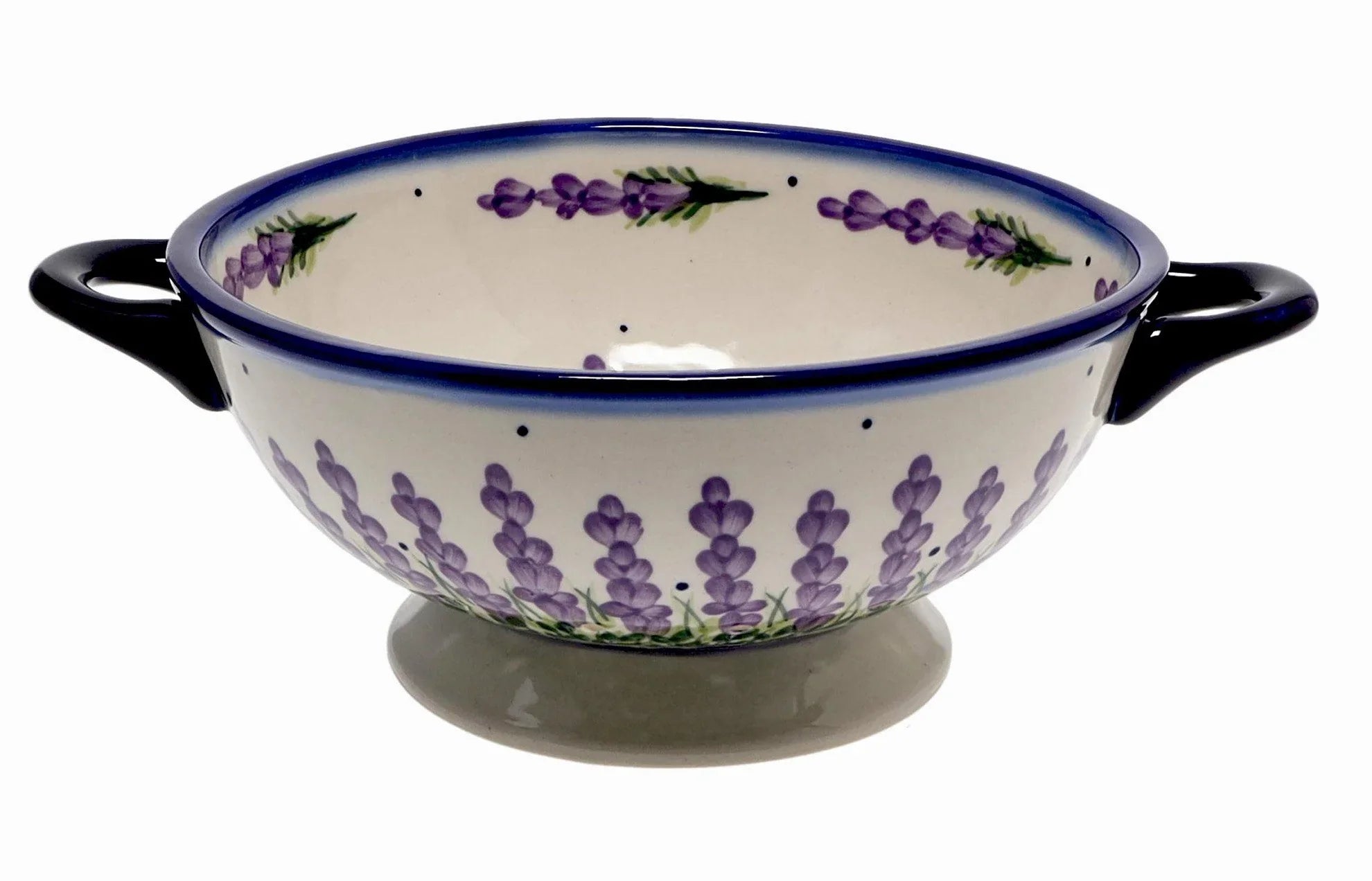 Imagine a masterpiece that not only beautifies your kitchen but also enhances your dining experience with its unique charm. Introducing the Polish Pottery Berry Bowl by W.R. Ceramika, a functional work of art that marries utility with aesthetic allure. Crafted in the heart of Boleslawiec, Poland, this exquisite bowl features the enchanting "Lavender Fields" pattern, where delicate lavender blossoms dance amidst soft green foliage against a crisp white backdrop. This bowl isn't just for kitchen use; it's a statement piece that begs to be displayed, effortlessly turning everyday fruit rinsing into a display of elegance.