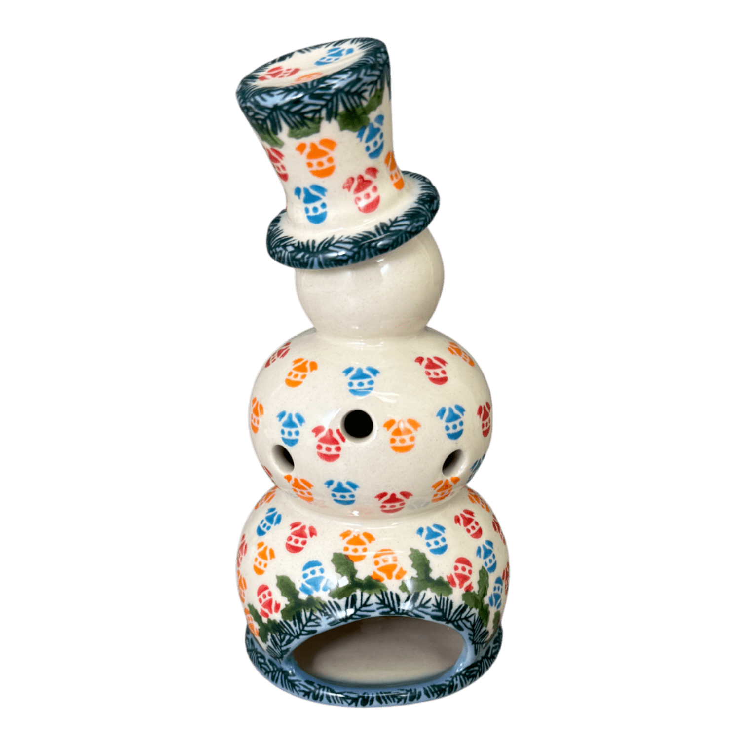 Step into the whimsical world of winter wonder with the enchanting Polish Pottery Luminary! Shaped like a cheerful snowman, this delightful piece stands 7 inches tall and is crafted by the skilled artisans of Galia in Boleslawiec, Poland. Adorned in the vibrant "Colorful Baubles" pattern, it showcases a playful dance of red, blue, and orange ornaments intertwined with green garland, all framed by a striking cobalt blue rim. As the light flickers within, this luminary casts a warm, inviting glow, perfect for cozying up your home during the chilly holiday season.