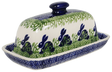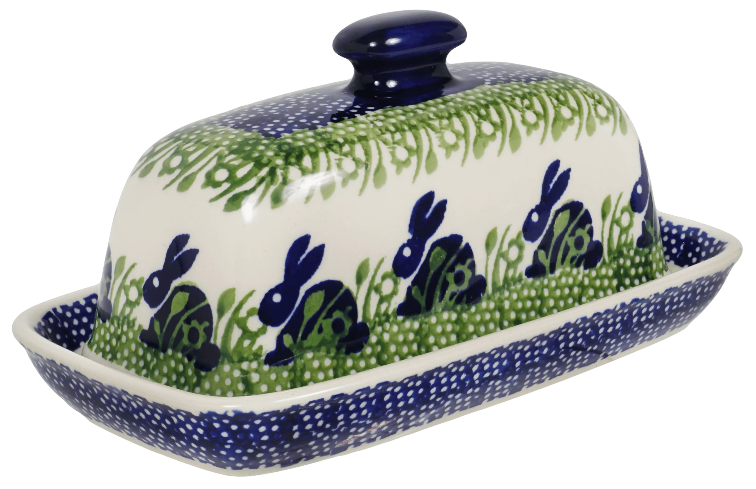 Introducing the Polish Pottery 7.5" x 4" American Butter Dish by Manufaktura in the delightful "Bunny Love" pattern (P324). This butter dish is not just any ordinary home for your stick of butter or margarine – it's an eye-catching and charming addition to your kitchen!