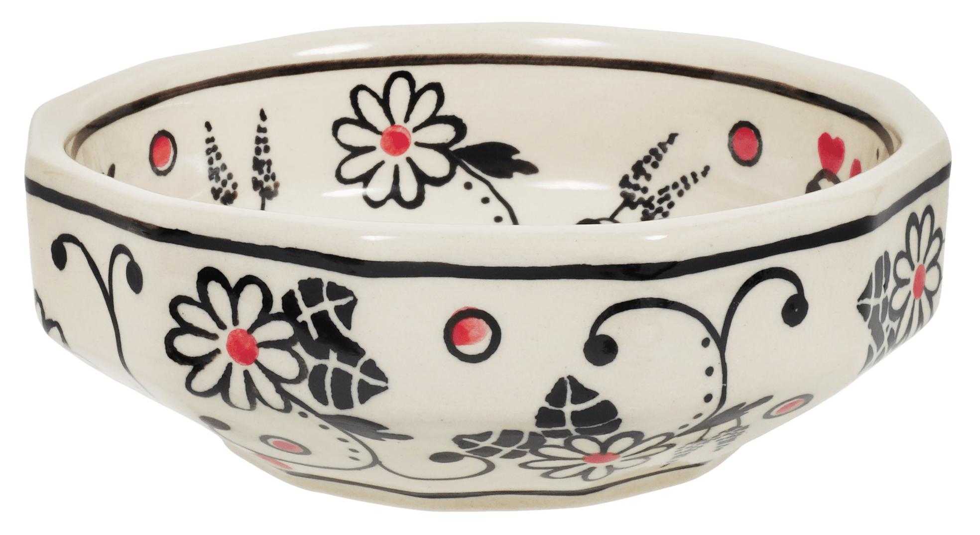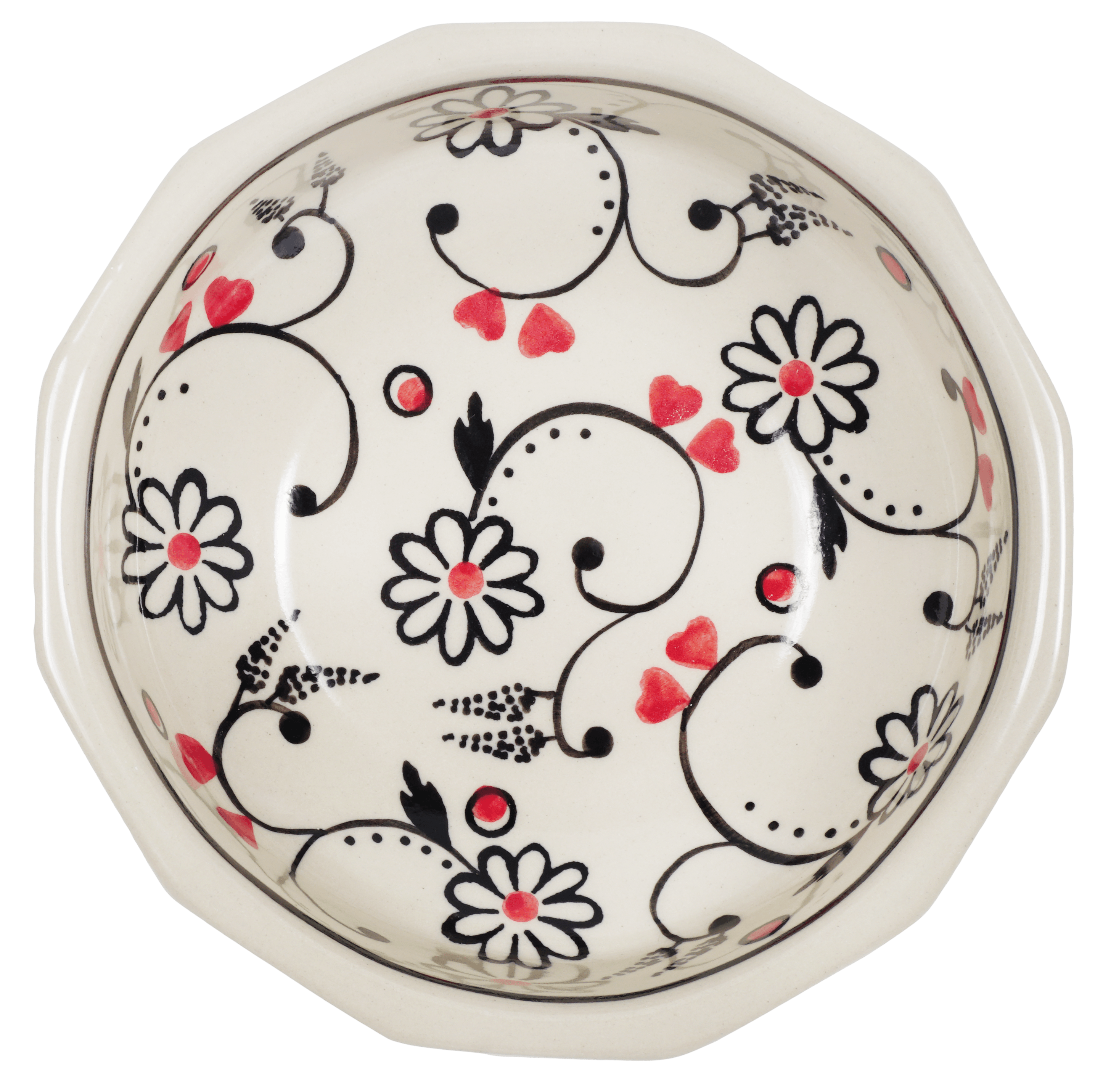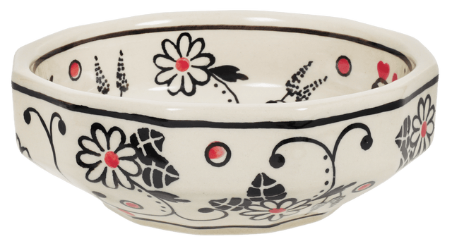 The "Night Garden" pattern is a true masterpiece, combining elegant design elements of flowers and hearts in a predominantly white color. The accents in black and red add a touch of drama and sophistication. Each bowl is meticulously hand-painted by skilled artisans in Boleslawiec, Poland, ensuring that every piece is a work of art.