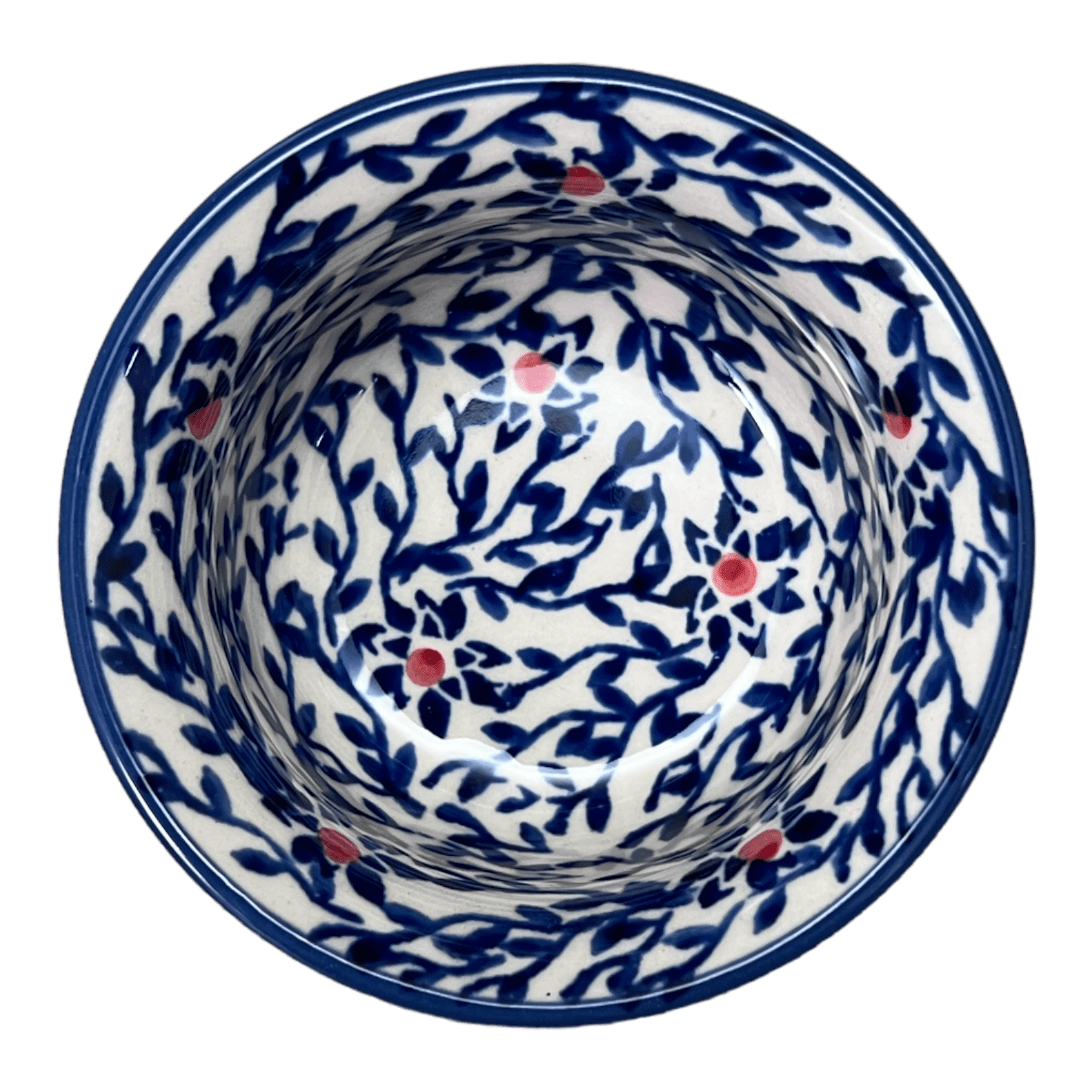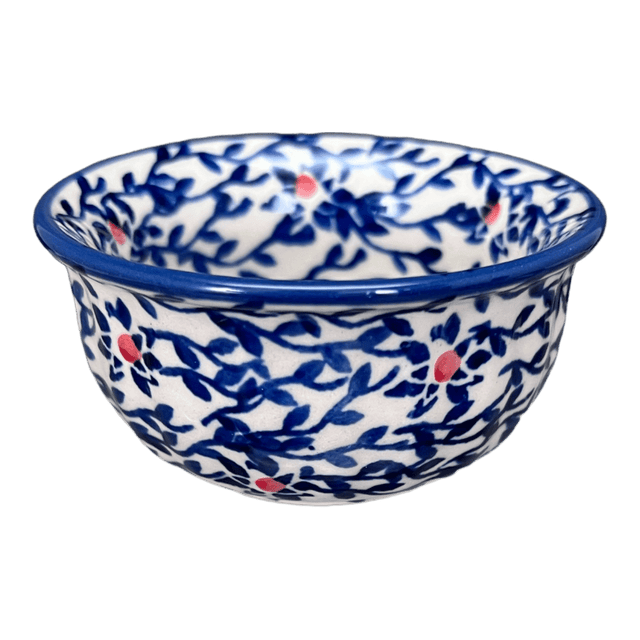 Introducing the Polish Pottery 3.5" Bowl by Manufaktura in the captivating "Blue Canopy" pattern (IS04). This little bowl is not just your ordinary ramekin or dipping bowl, it is a work of art! The "Blue Canopy" pattern boasts a stunning combination of design elements incorporating Leaves and Flowers, all elegantly hand-painted in a predominantly Blue color with accents in White and Red. This bowl is guaranteed to add a touch of charm and sophistication to any table setting.