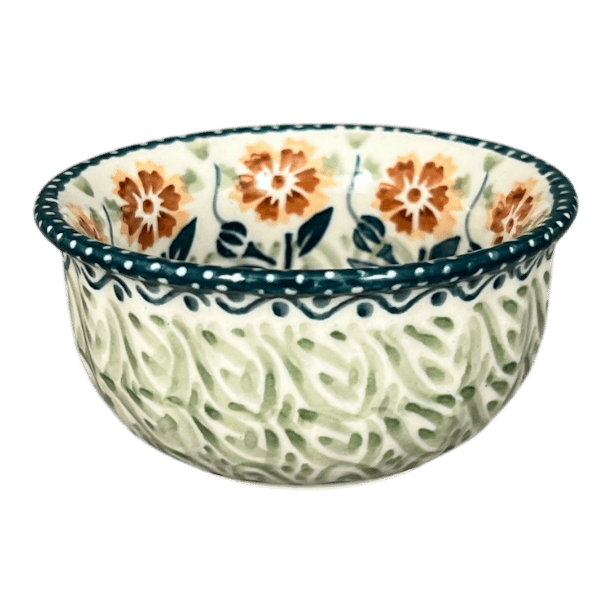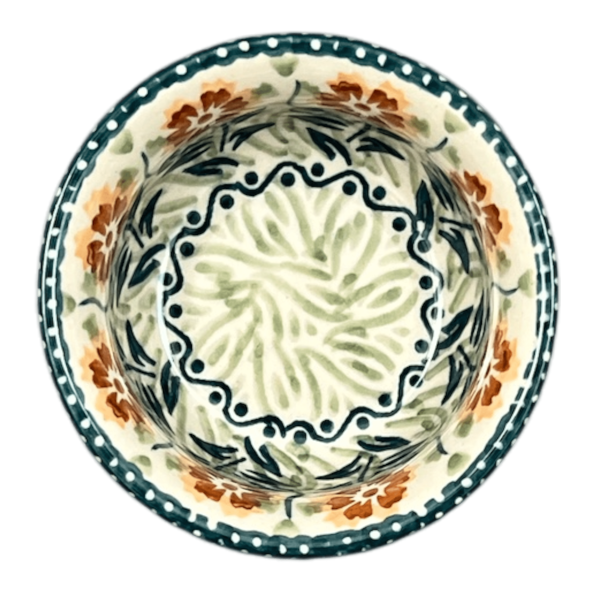 The "Green Floral Vine" design is nothing short of a visual feast. Dive into the intricate world of Unikat artistry, where each stroke and color is applied with precision by the most skilled artisans of Manufaktura. The pattern features a harmonious blend of brown, orange, and white flowers, nestled between bands of teal green leaves and vines, accented with tiny orange dots filling the spaces in between. Each bowl carries the prestigious "UNIKAT" stamp at its base, a testament to its uniqueness and the high level of craftsmanship invested in its creation. This level of detail not only enhances its aesthetic appeal but also its collectible value, making it a treasured piece in any pottery enthusiast's collection.