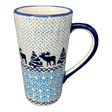 Imagine wrapping your hands around a mug that not only warms them with your favorite hot beverage but also brings a touch of artistic tradition right to your morning routine. Introducing the John's Mug from Manufaktura, a standout piece in the "Peaceful Season" collection. Crafted in the heart of Boleslawiec, Poland, this 12 oz. Polish pottery mug is a marvel of craftsmanship and design. Its tall, slim structure is purposefully shaped to keep your coffee or tea delightfully warm for longer. The "Peaceful Season" pattern is a festive celebration on ceramic, featuring a charming scene of large dark blue moose and Christmas trees encircling a flurry of light blue and white snowflakes, all set against a crisp white background.